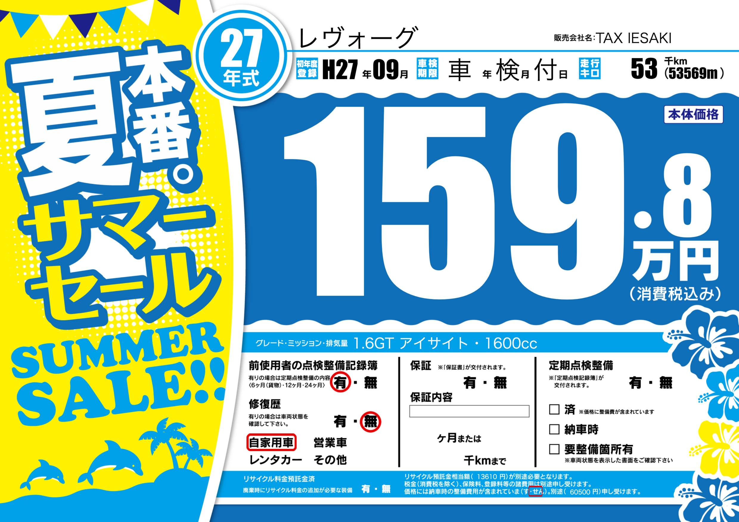 | 走行キロ | 5.3万km | 初年度登録 | H27年09月 |