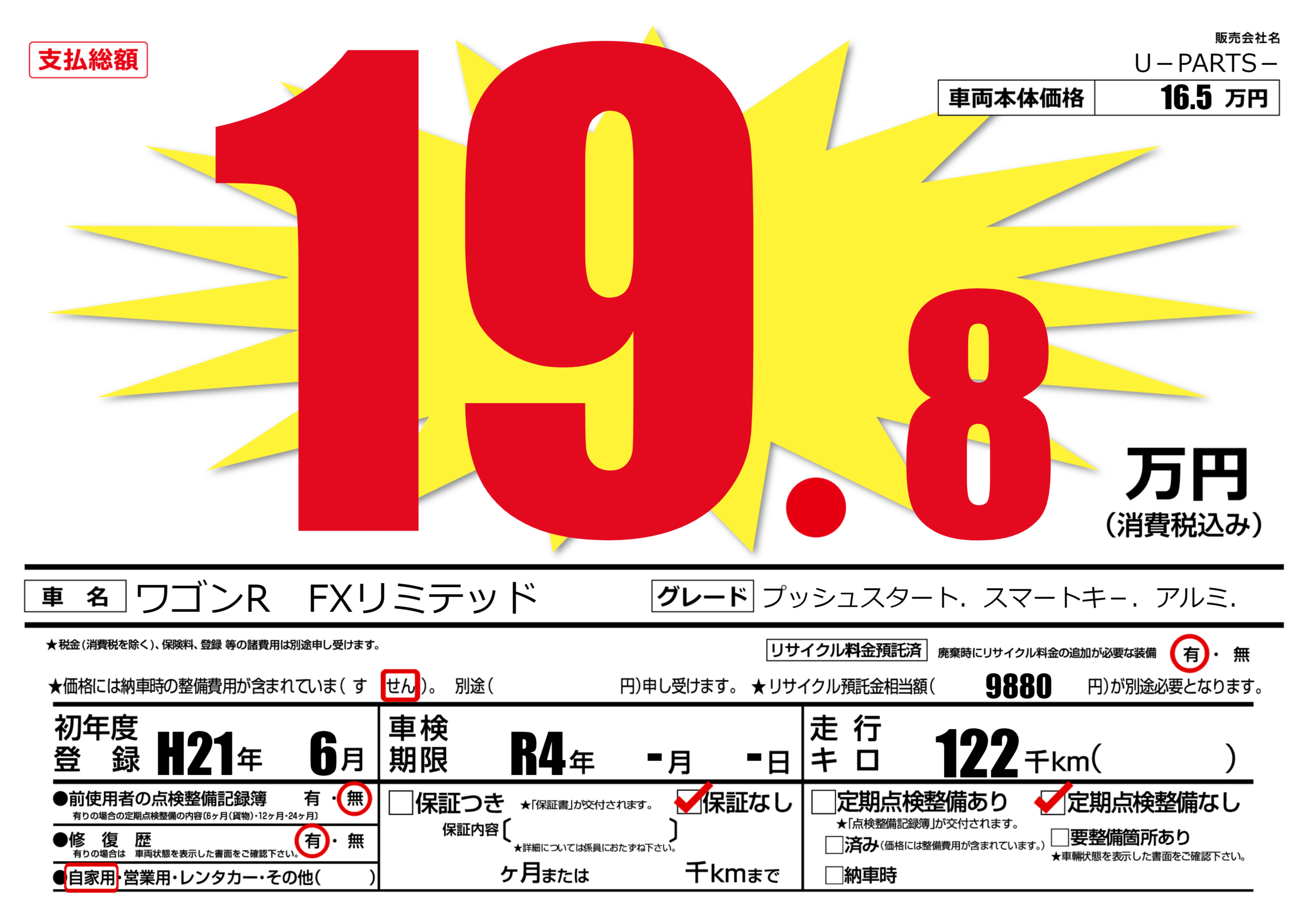 | 車名 | ワゴンR FXリミテッド | グレード ミッション 排気量 |