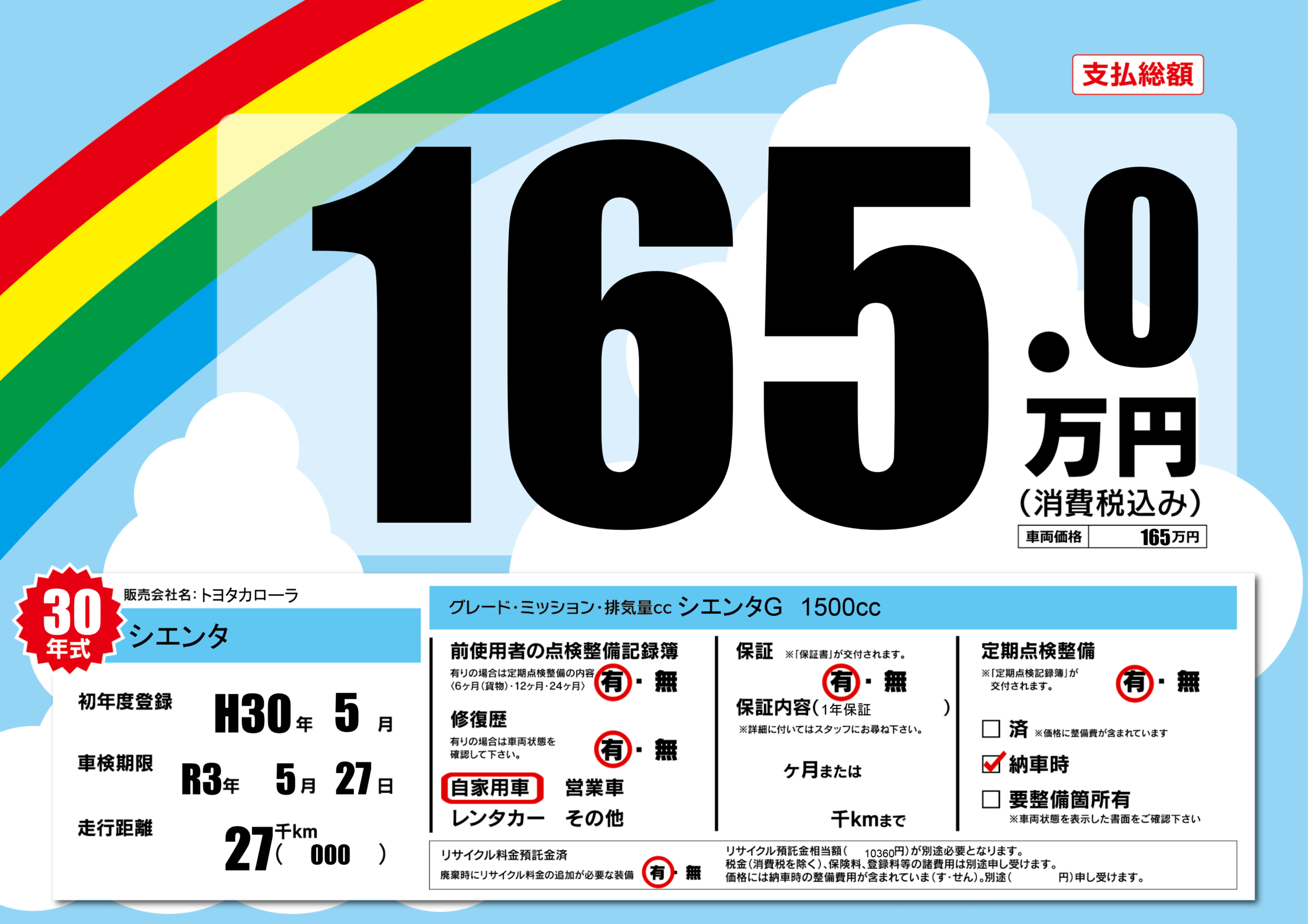 | 車名 | シエンタ | グレード ミッション 排気量 |