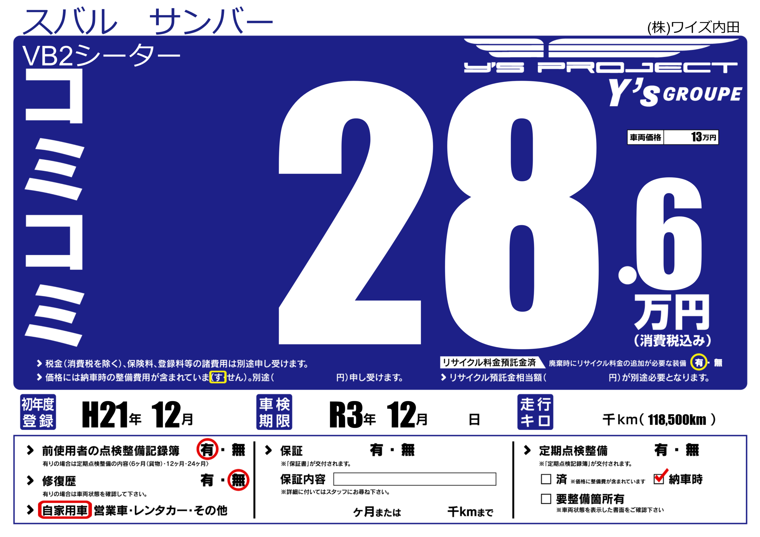 | 車検制限 | R3年 12月 - 日 | ||
