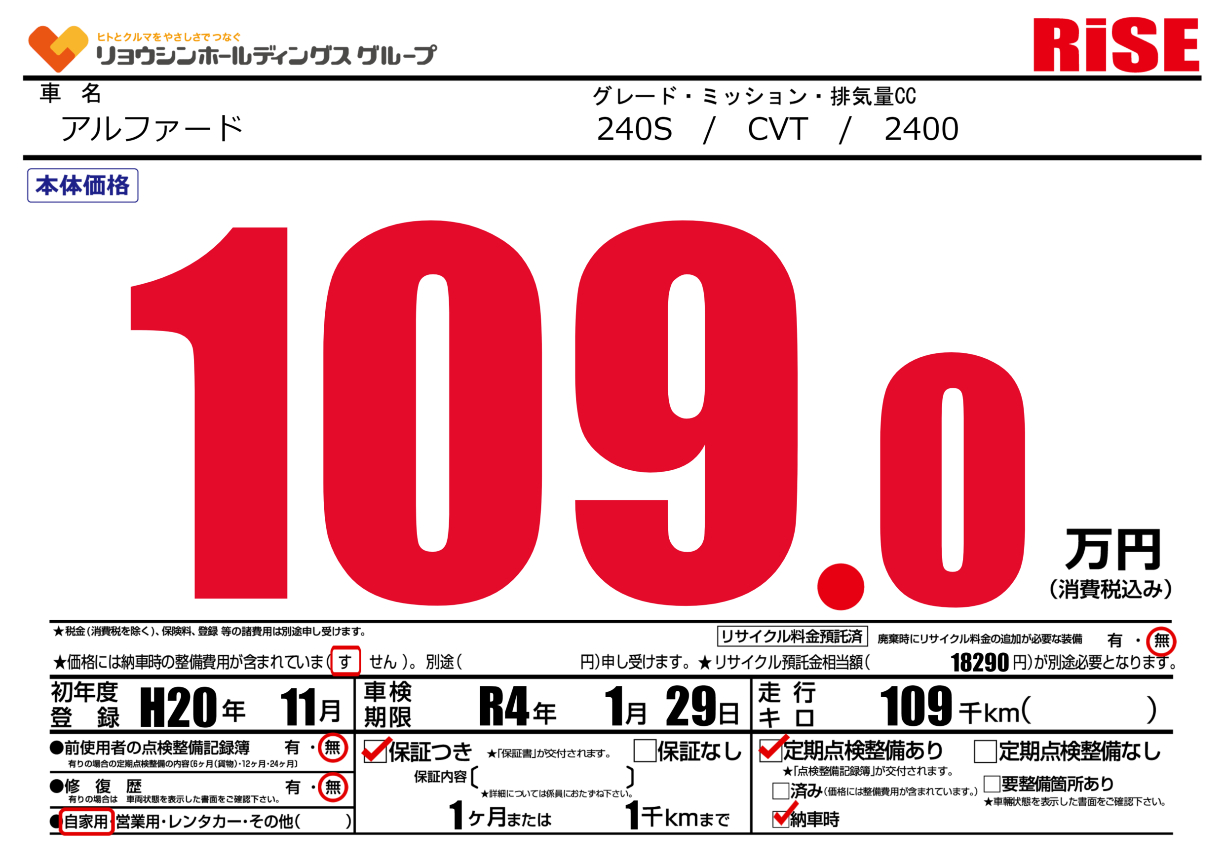 | 車名 | アルファード | グレード ミッション 排気量 |