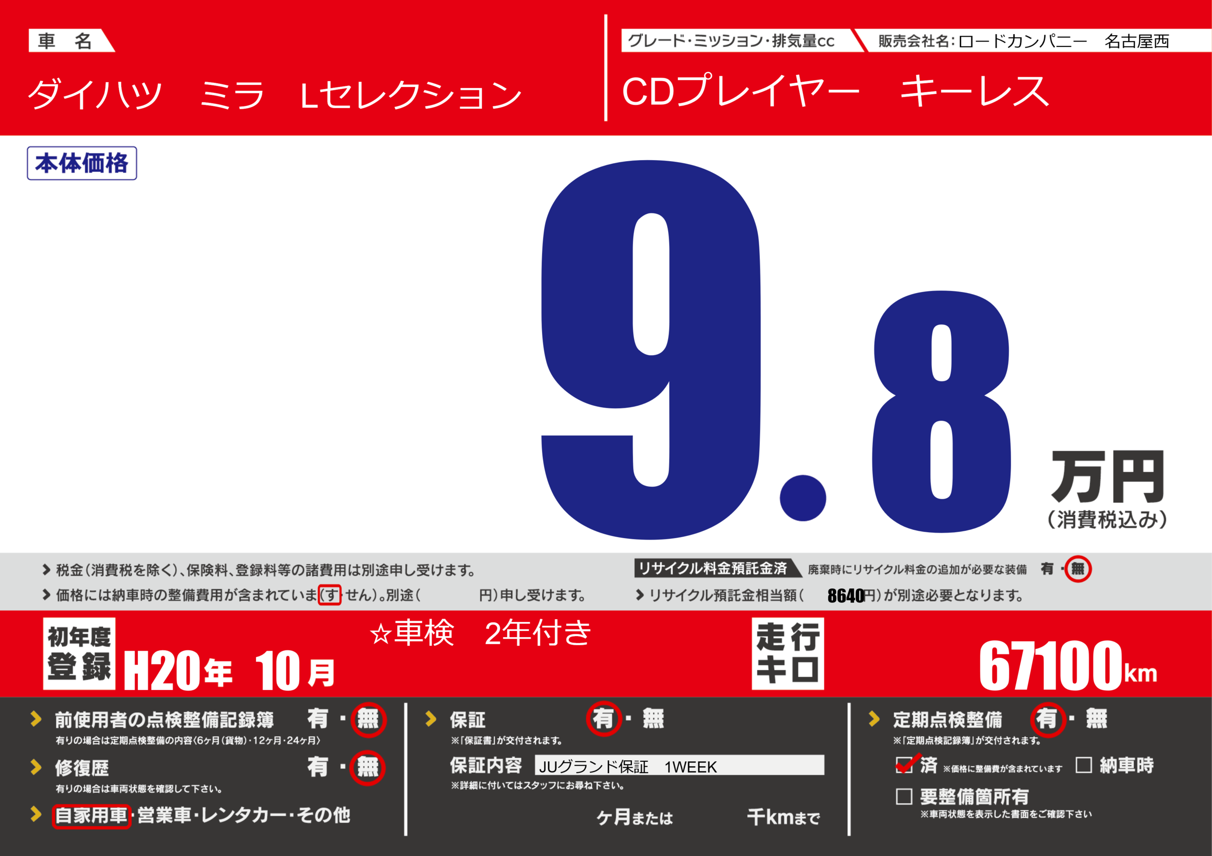 | 定期点検整備 | 定期点検整備あり 定期点検整備済み | ||