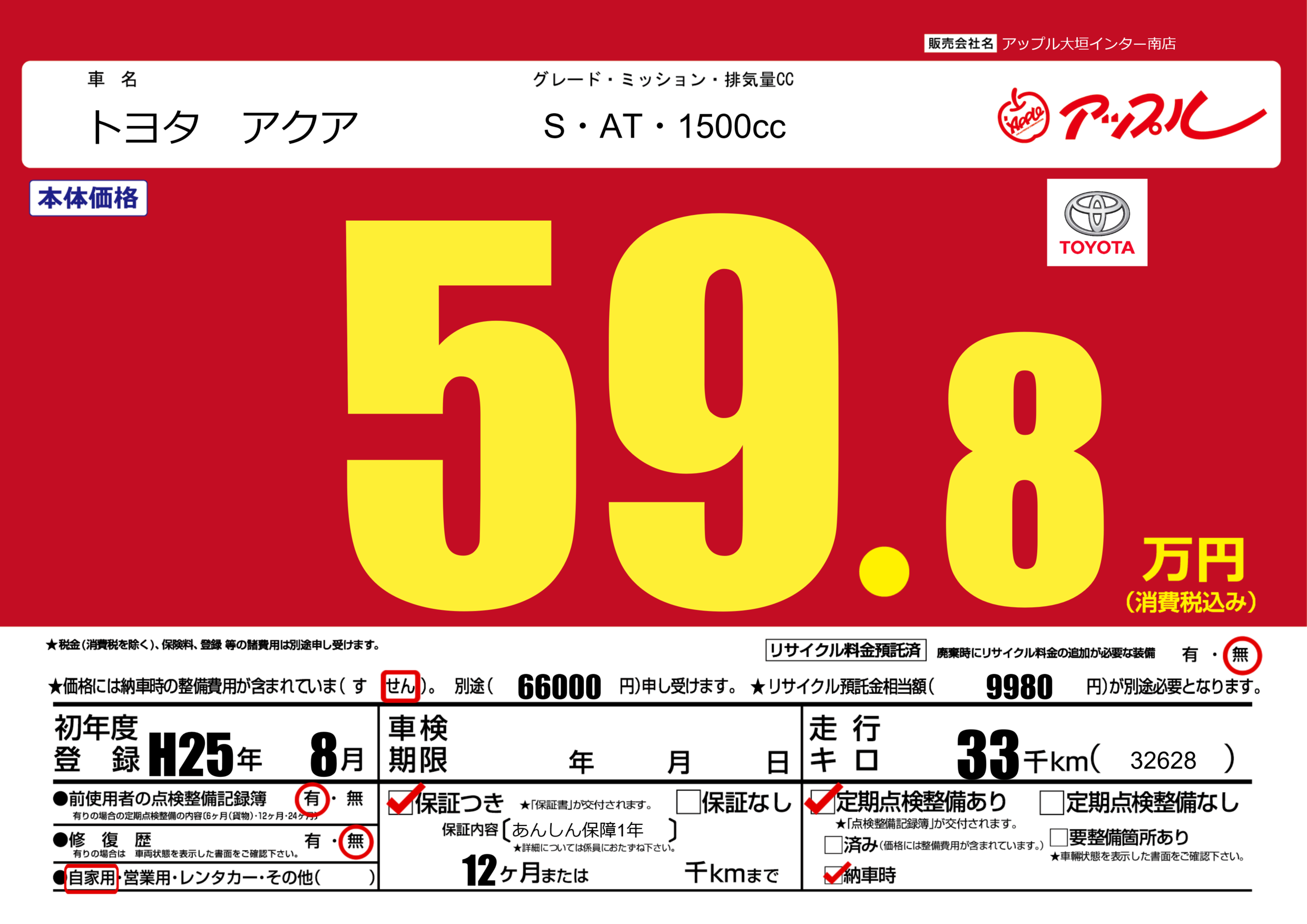 | 車名 | トヨタ アクア | グレード ミッション 排気量 |