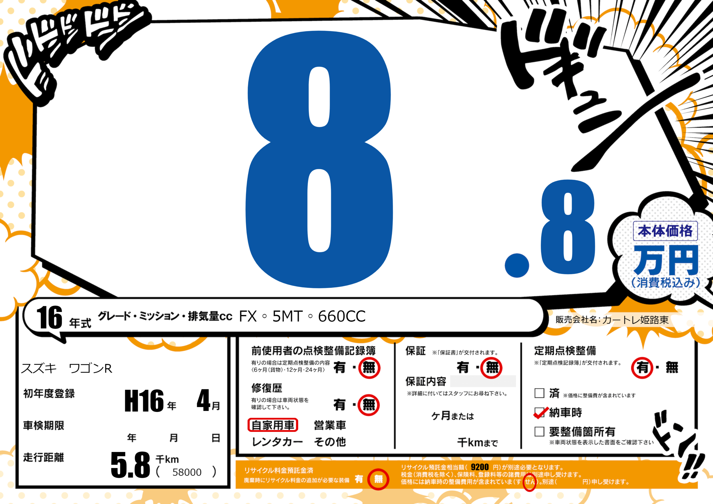 | 走行キロ | 0.5万km | 初年度登録 | H16年4月 |