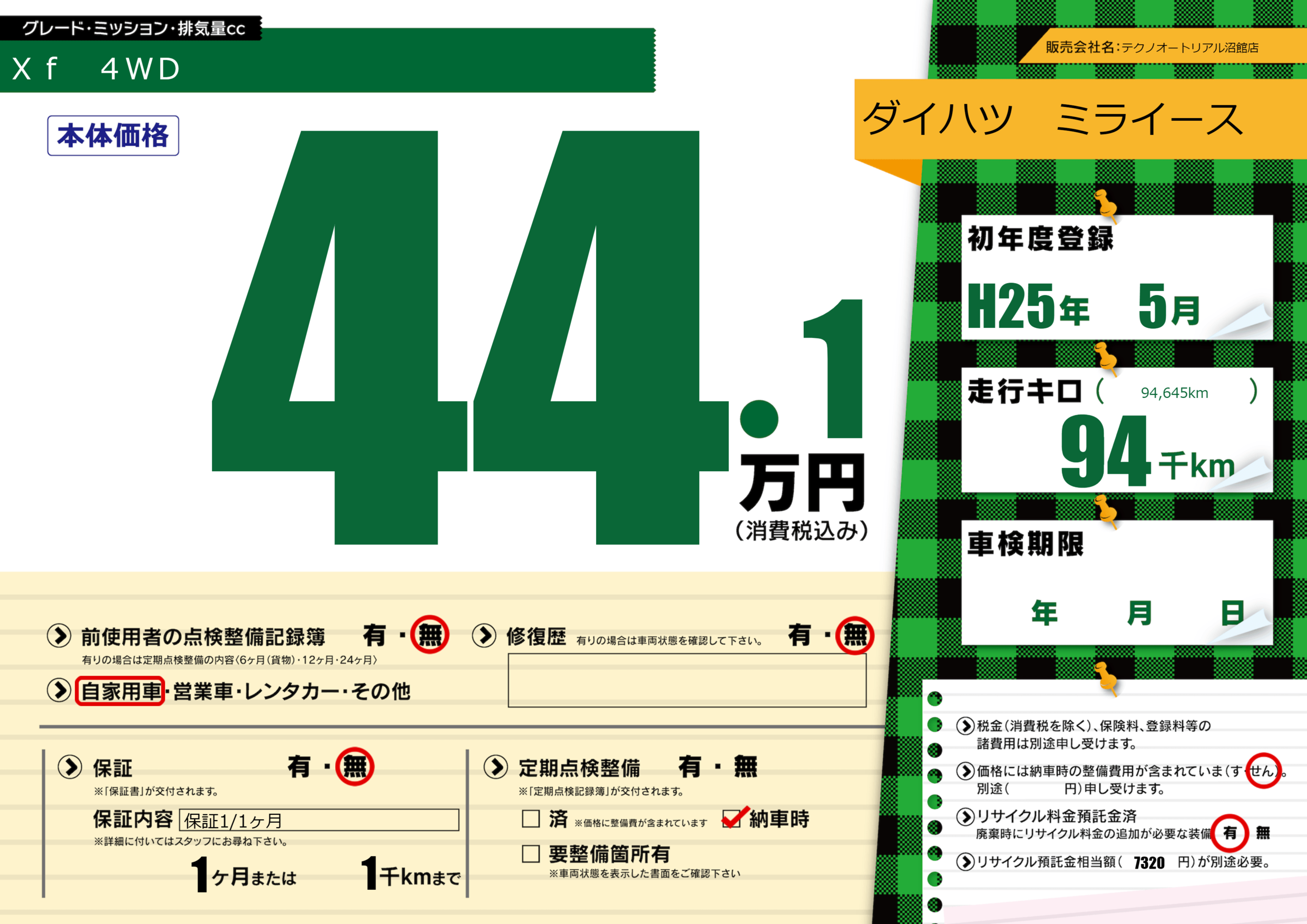 保証なし 保証内容(保証1/1ヶ月) 1ヶ月または(1)千kmまで |