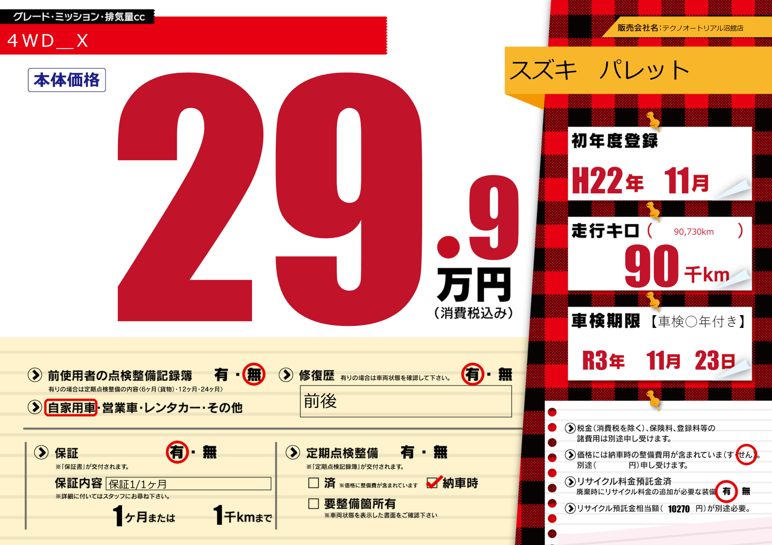| 走行キロ | 9万km | 初年度登録 | H22年11月 |