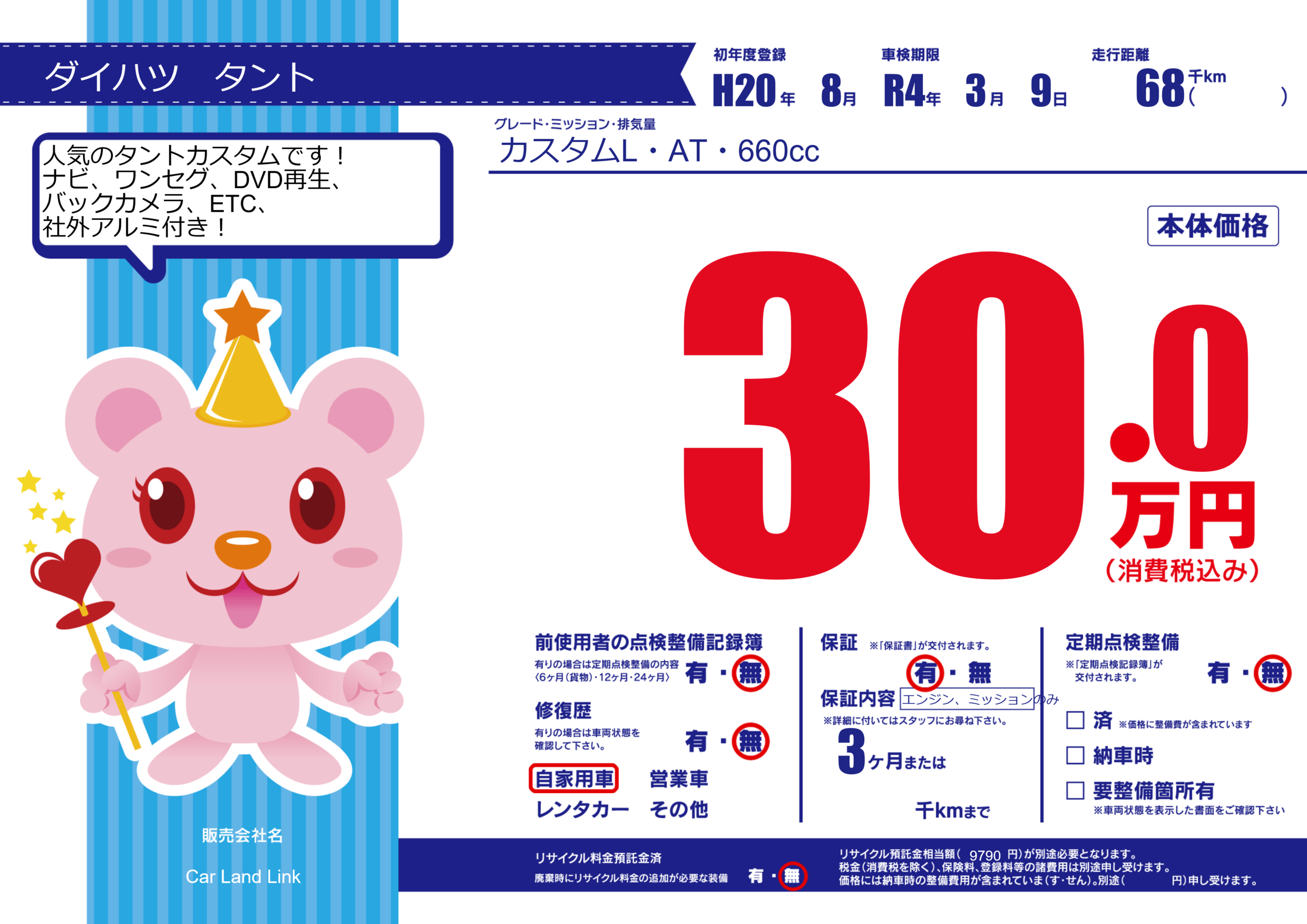 | 車名 | ダイハツ タント | グレード ミッション 排気量 |