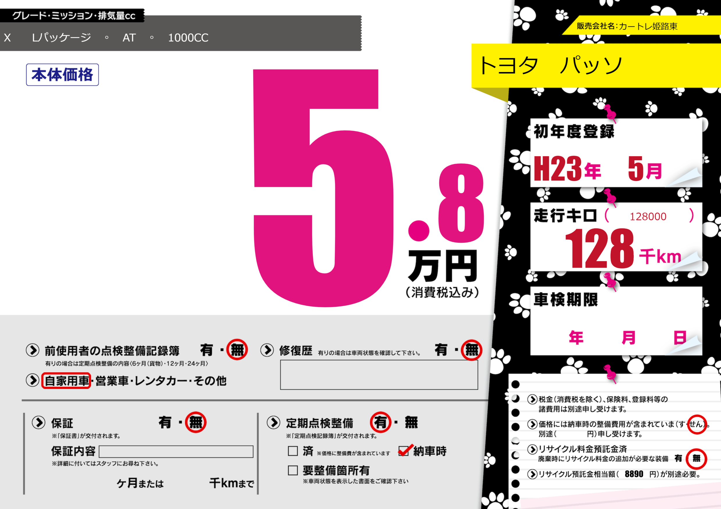 | 車名 | トヨタ パッソ | グレード ミッション 排気量 |