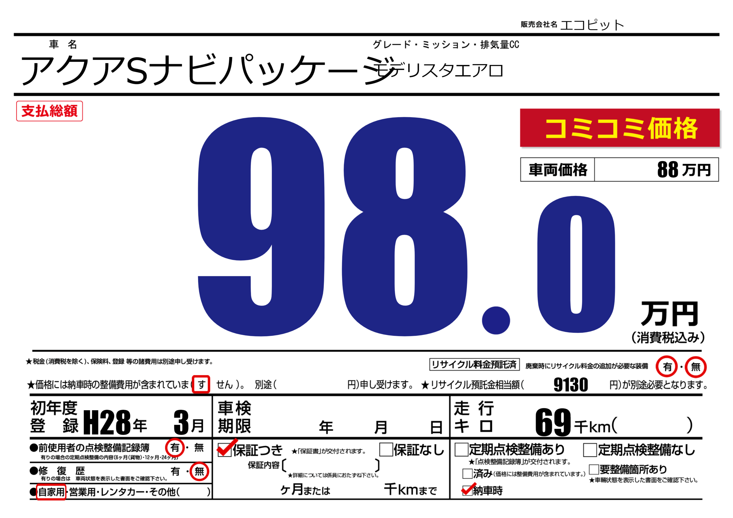 | 車名 | アクアSナビパッケージ | グレード ミッション 排気量 |