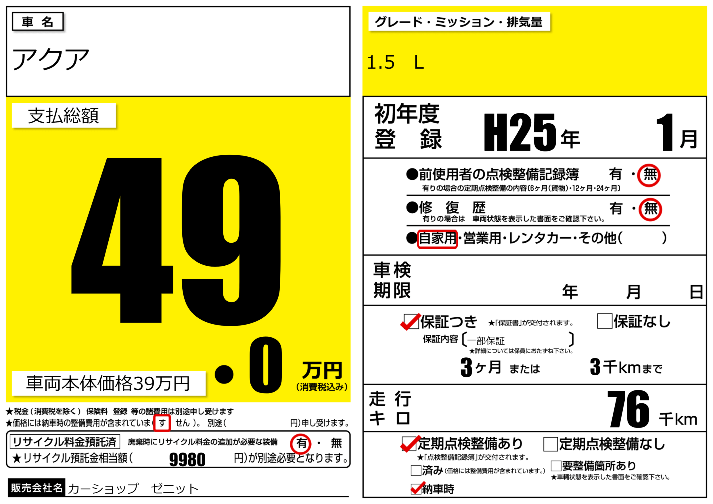 | 定期点検整備 | 定期点検整備あり 納車時あり | ||