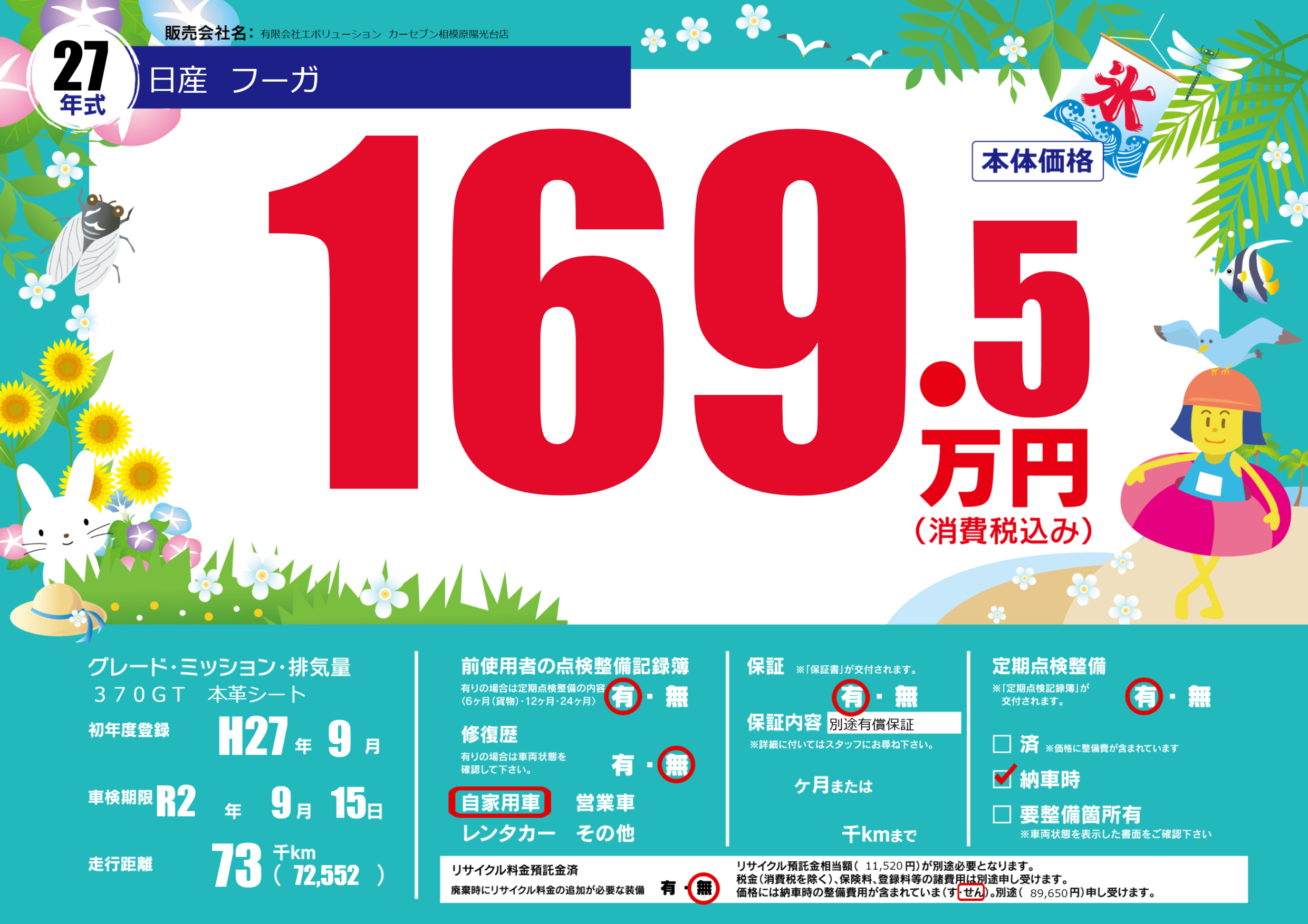 | 走行キロ | 7.3万km | 初年度登録 | H27年9月 |