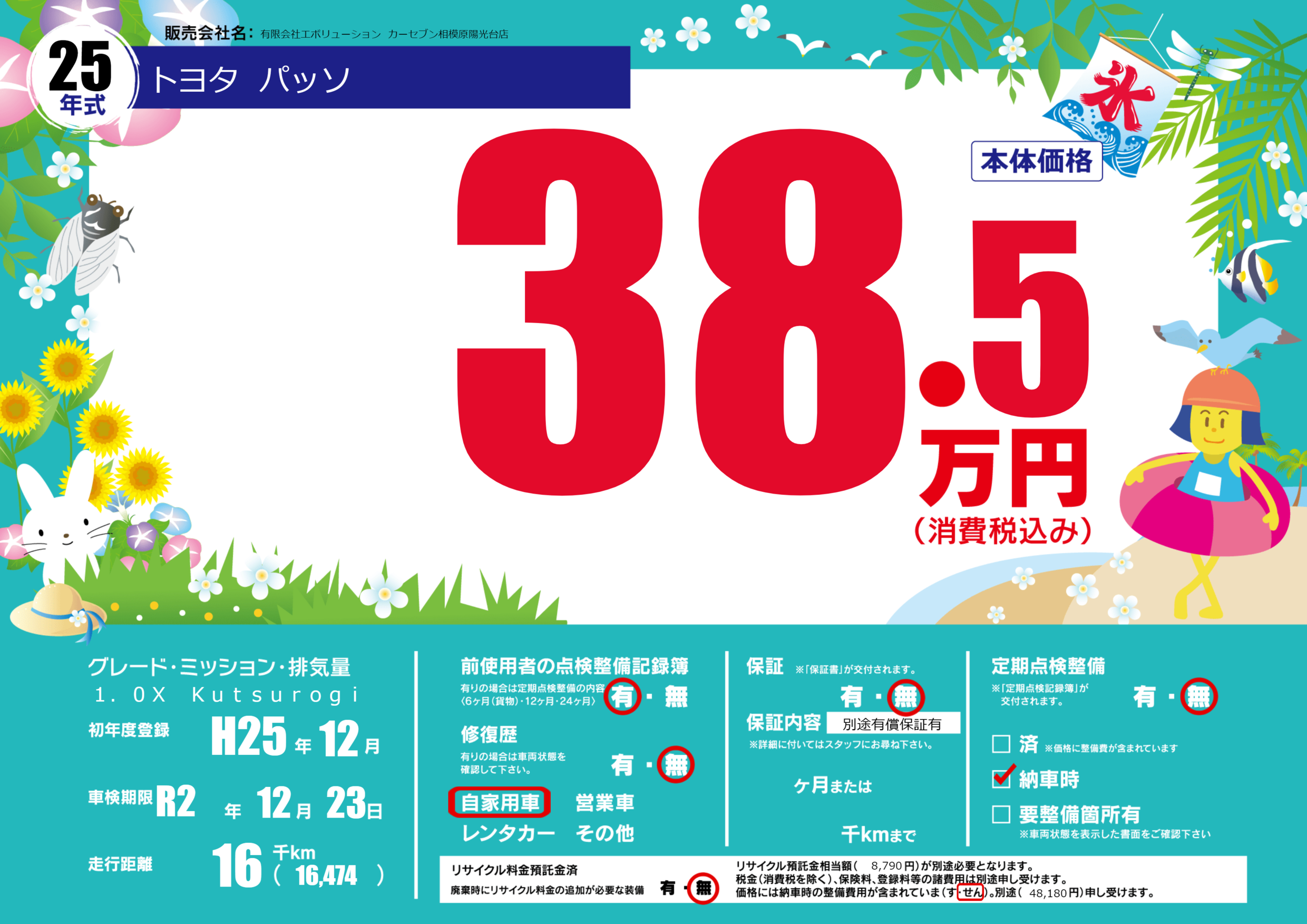 | 車名 | トヨタ パッソ | グレード ミッション 排気量 |