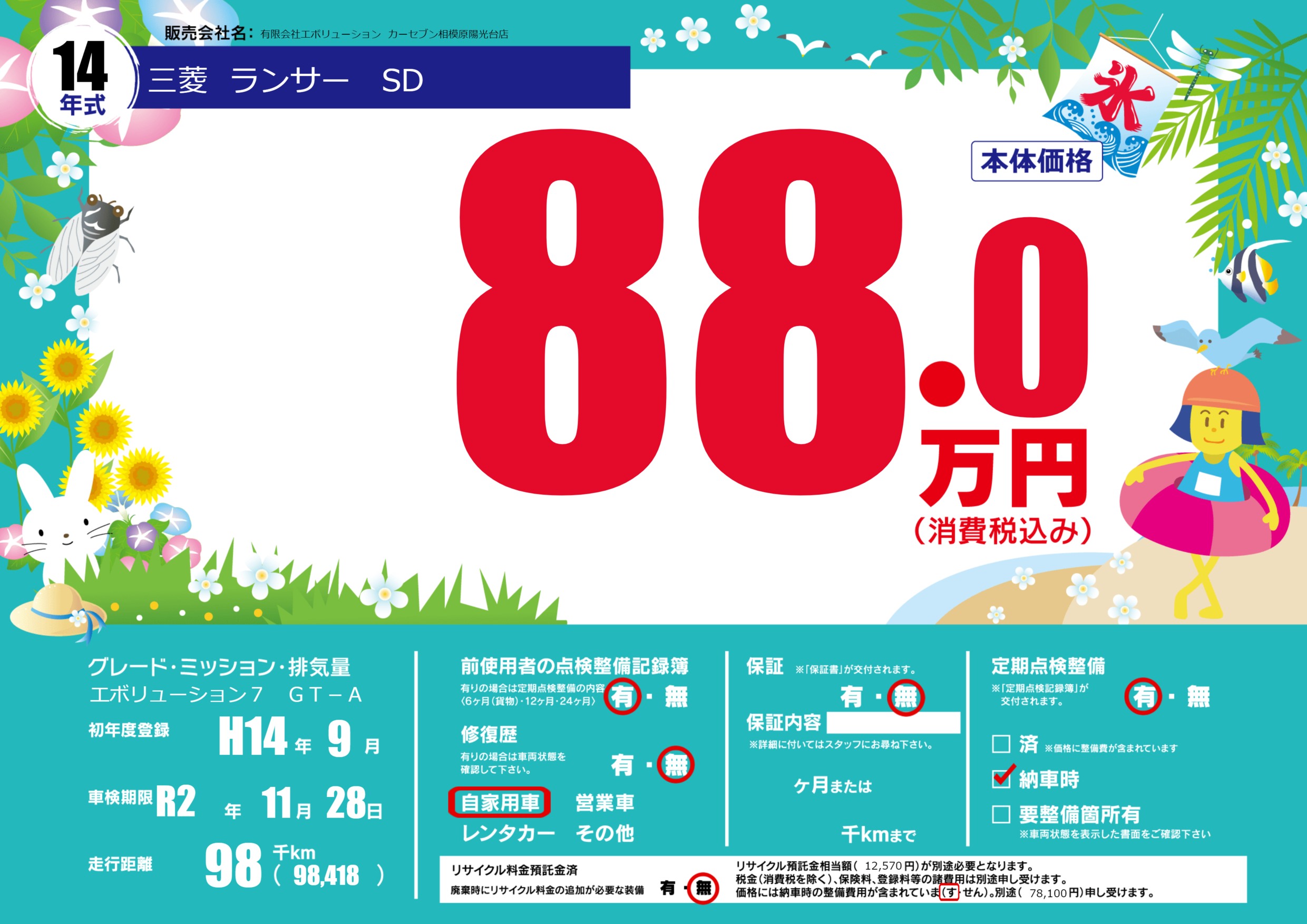 | 走行キロ | 9.8万km | 初年度登録 | H14年9月 |