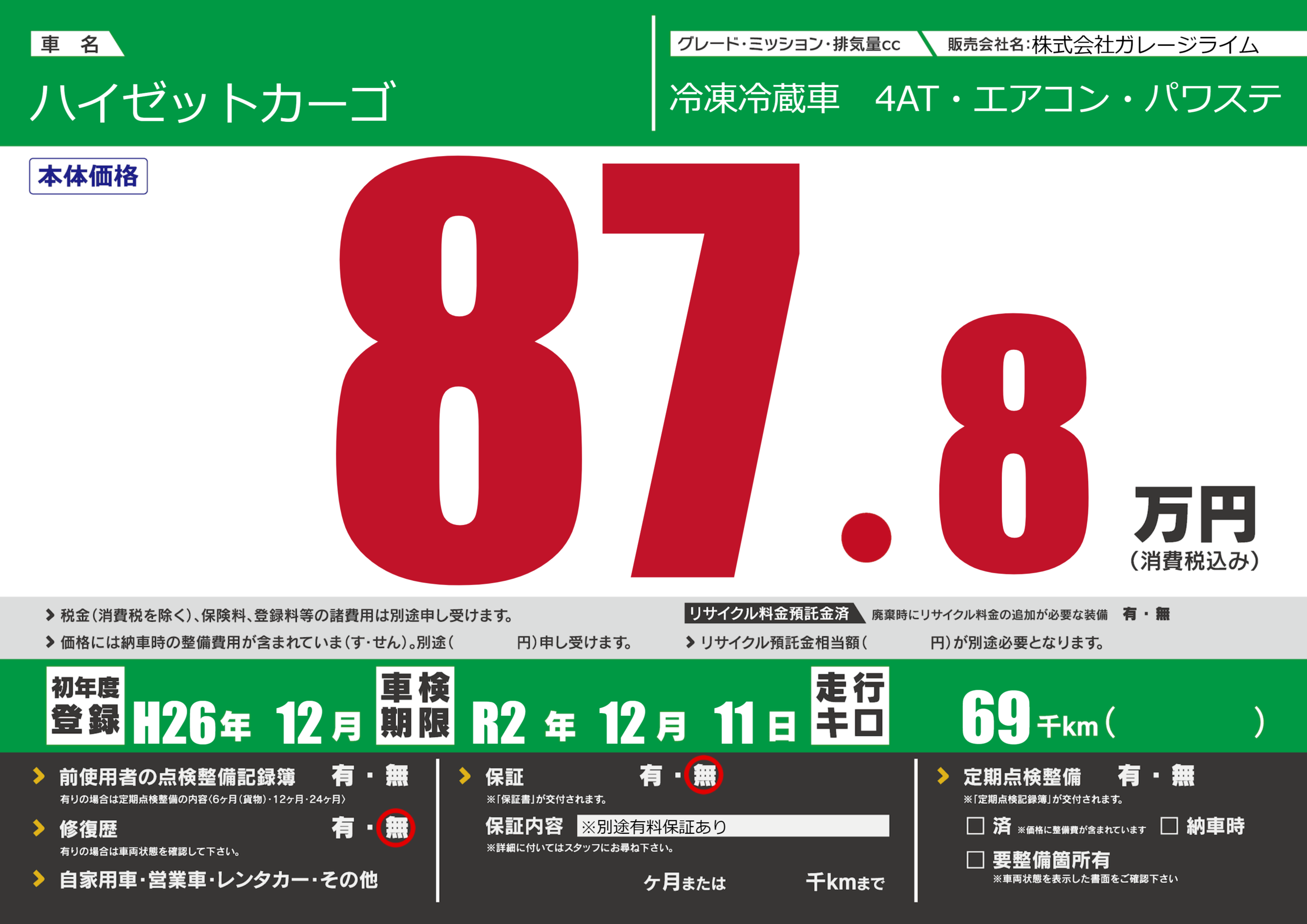 保証なし 保証内容(※別途有料保証あり) ---ヶ月または()千kmまで |