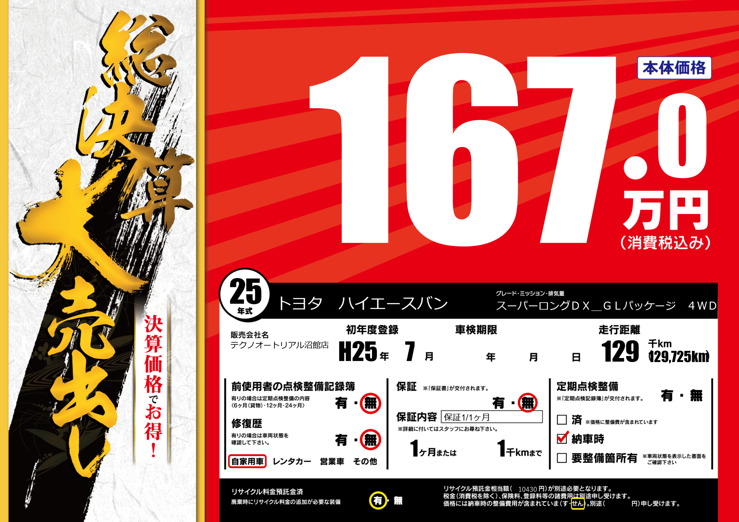 | 走行キロ | 12.9万km | 初年度登録 | H25年7月 |