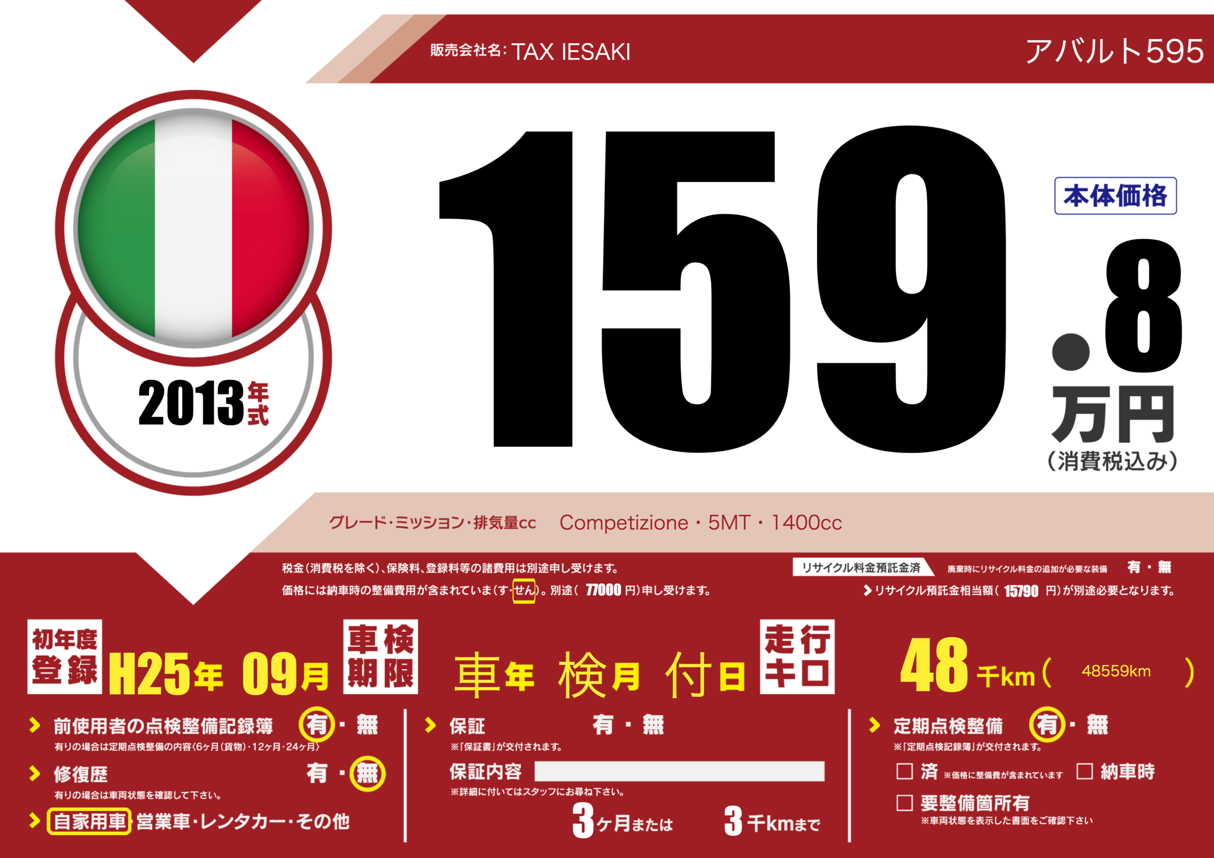 | 車名 | アバルト595 | グレード ミッション 排気量 |