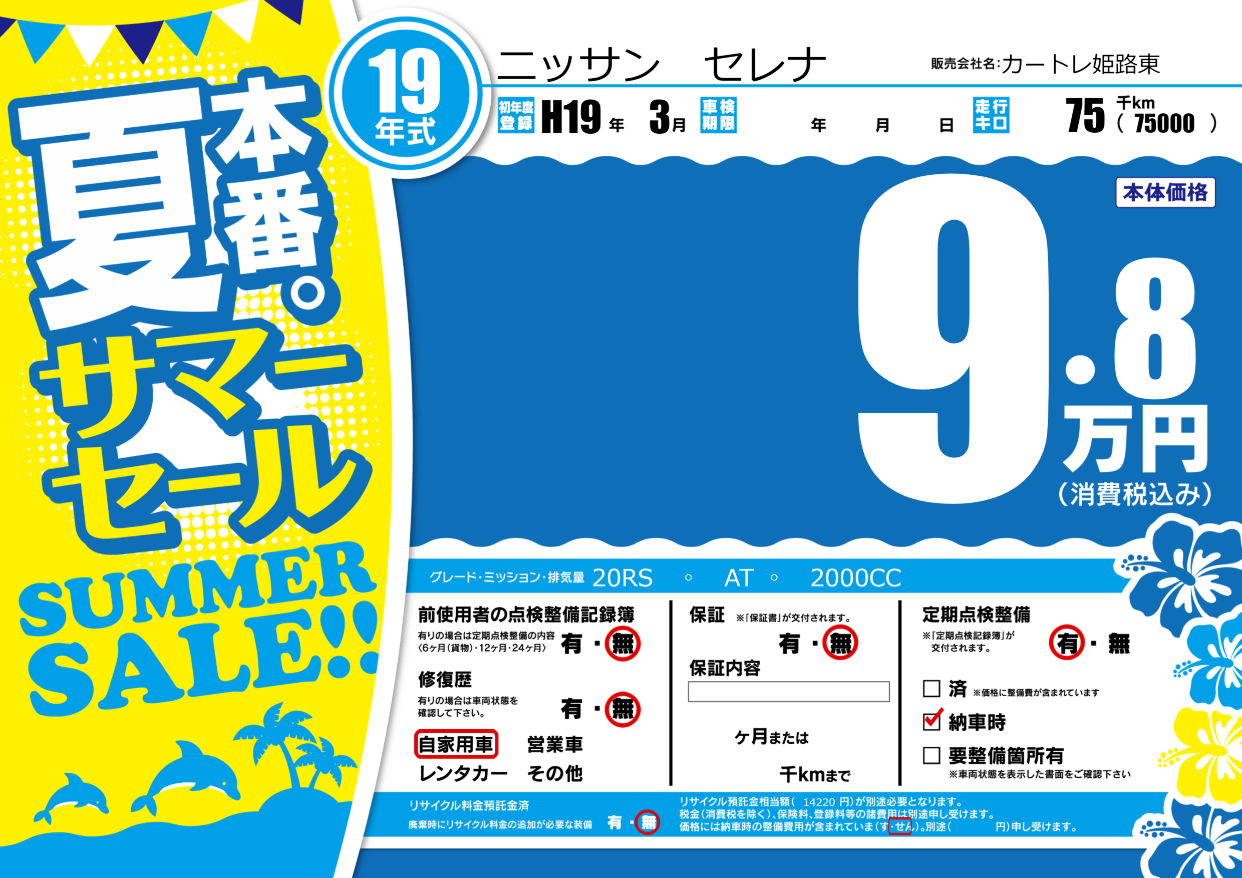 | 走行キロ | 7.5万km | 初年度登録 | H19年3月 |