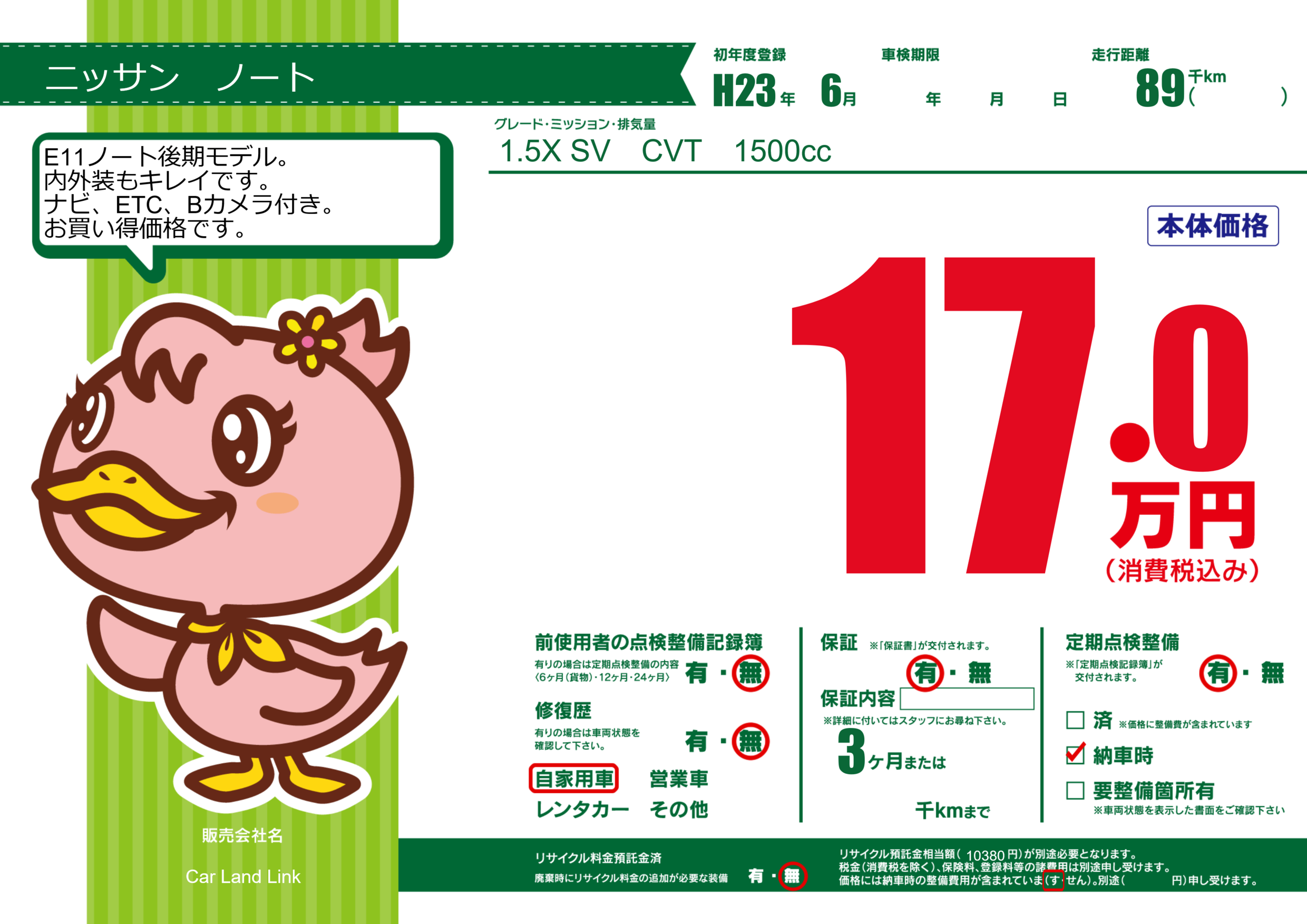 | 車名 | ニッサン ノート | グレード ミッション 排気量 |