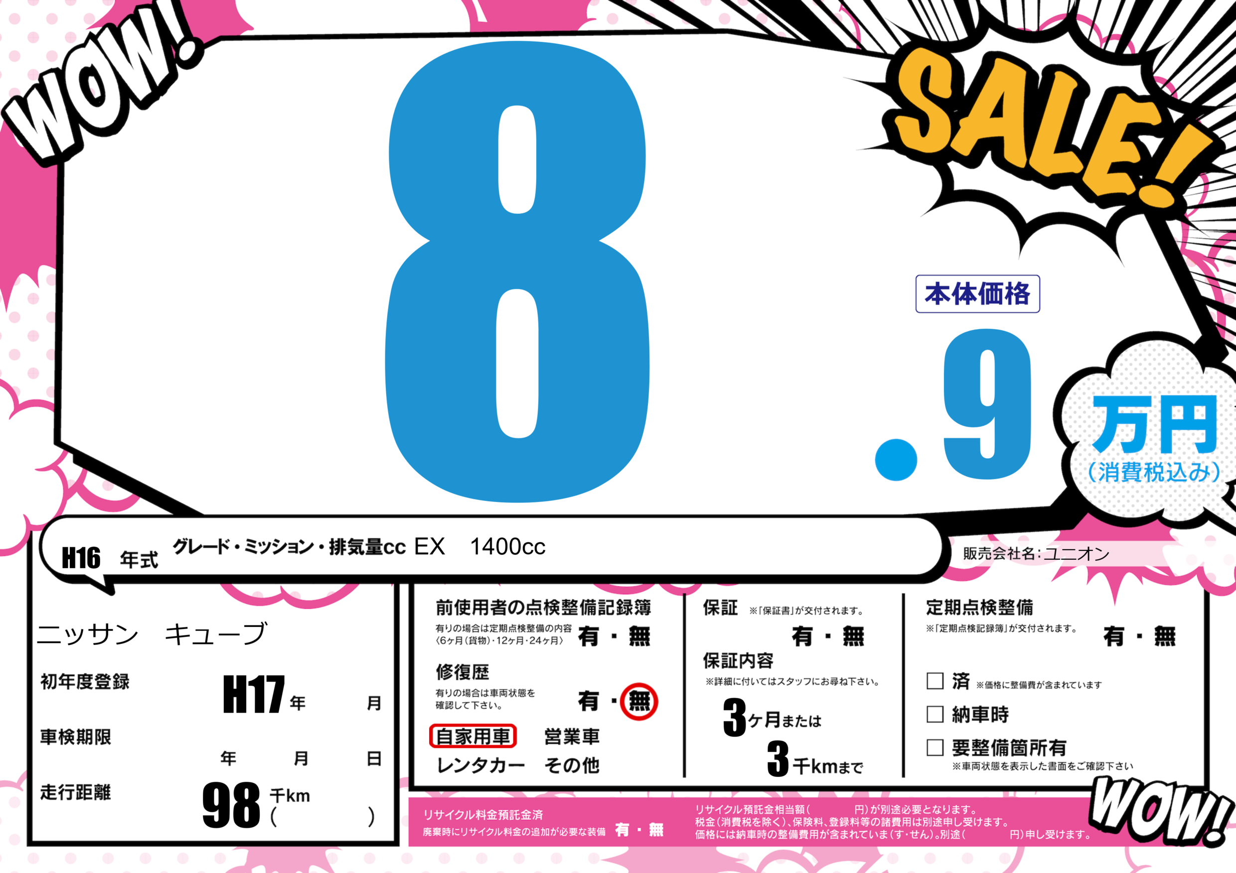 保証なし 保証内容(---) 3ヶ月または(3)千kmまで |