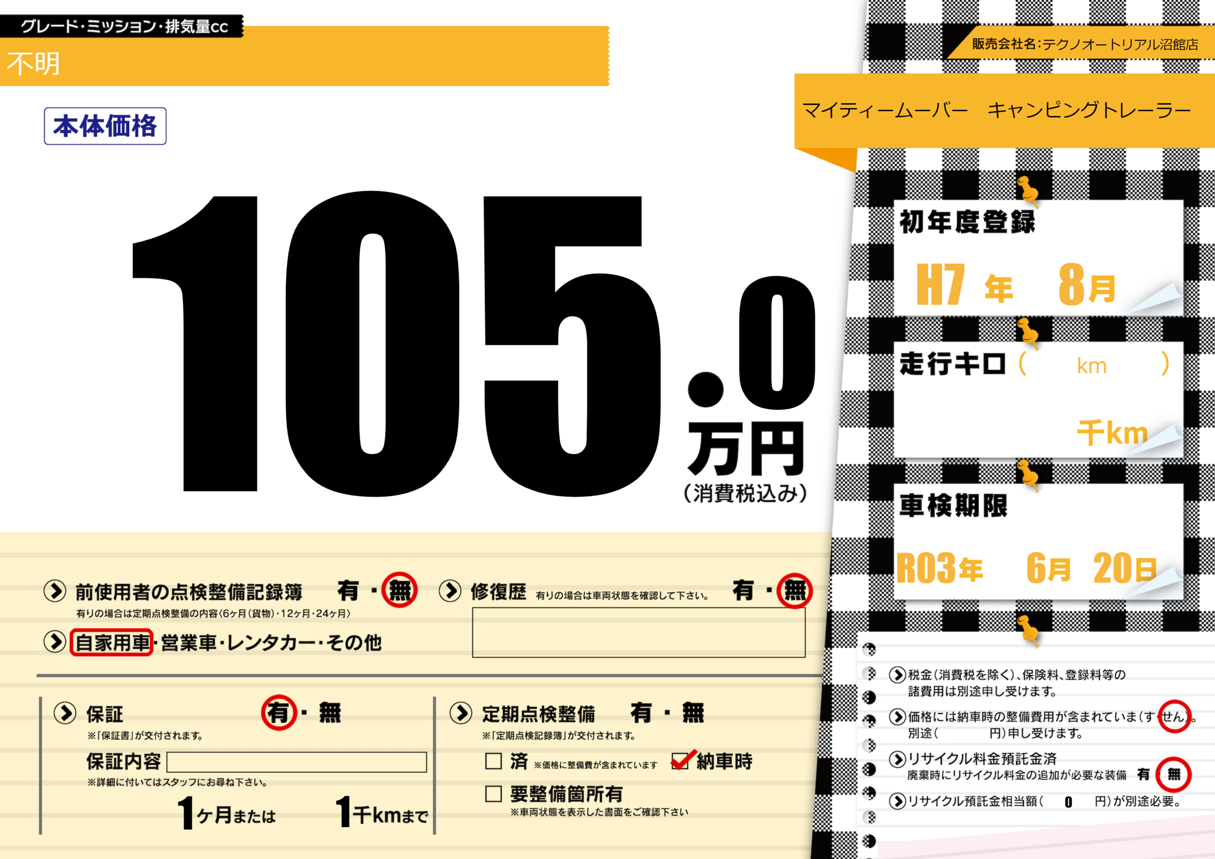 | 車名 | マイティームーバー キャンピングトレーラー | グレード ミッション 排気量 |