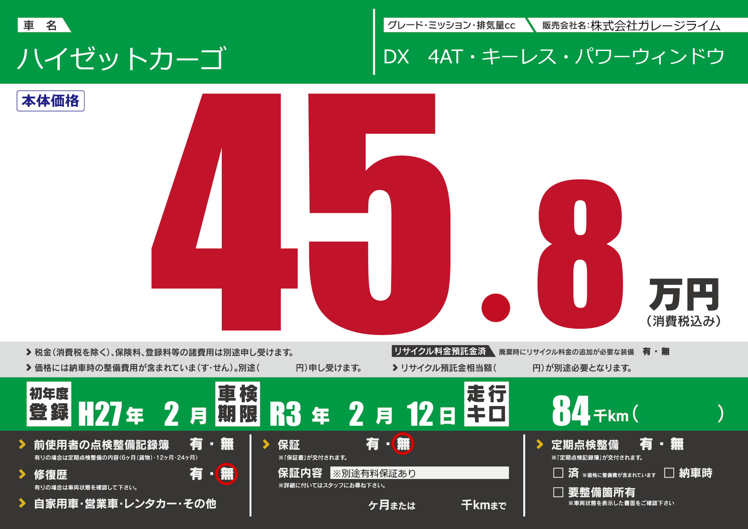 | 車名 | ハイゼットカーゴ | グレード ミッション 排気量 |