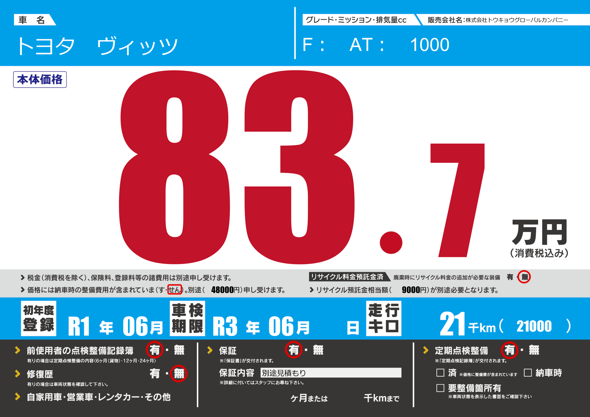 保証付き 保証内容(別途見積もり) ---ヶ月または()千kmまで |