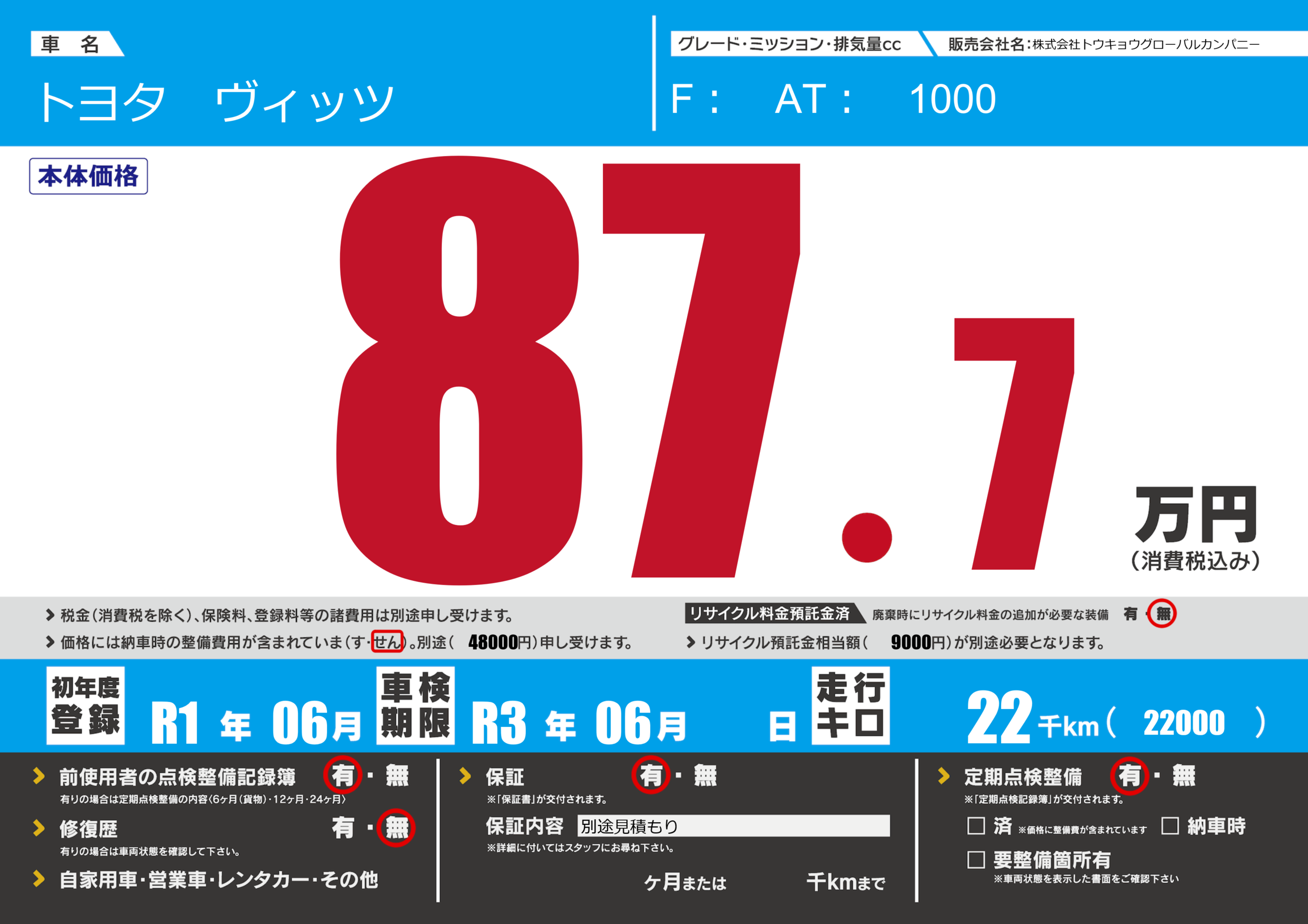 | 車名 | トヨタ ヴィッツ | グレード ミッション 排気量 |