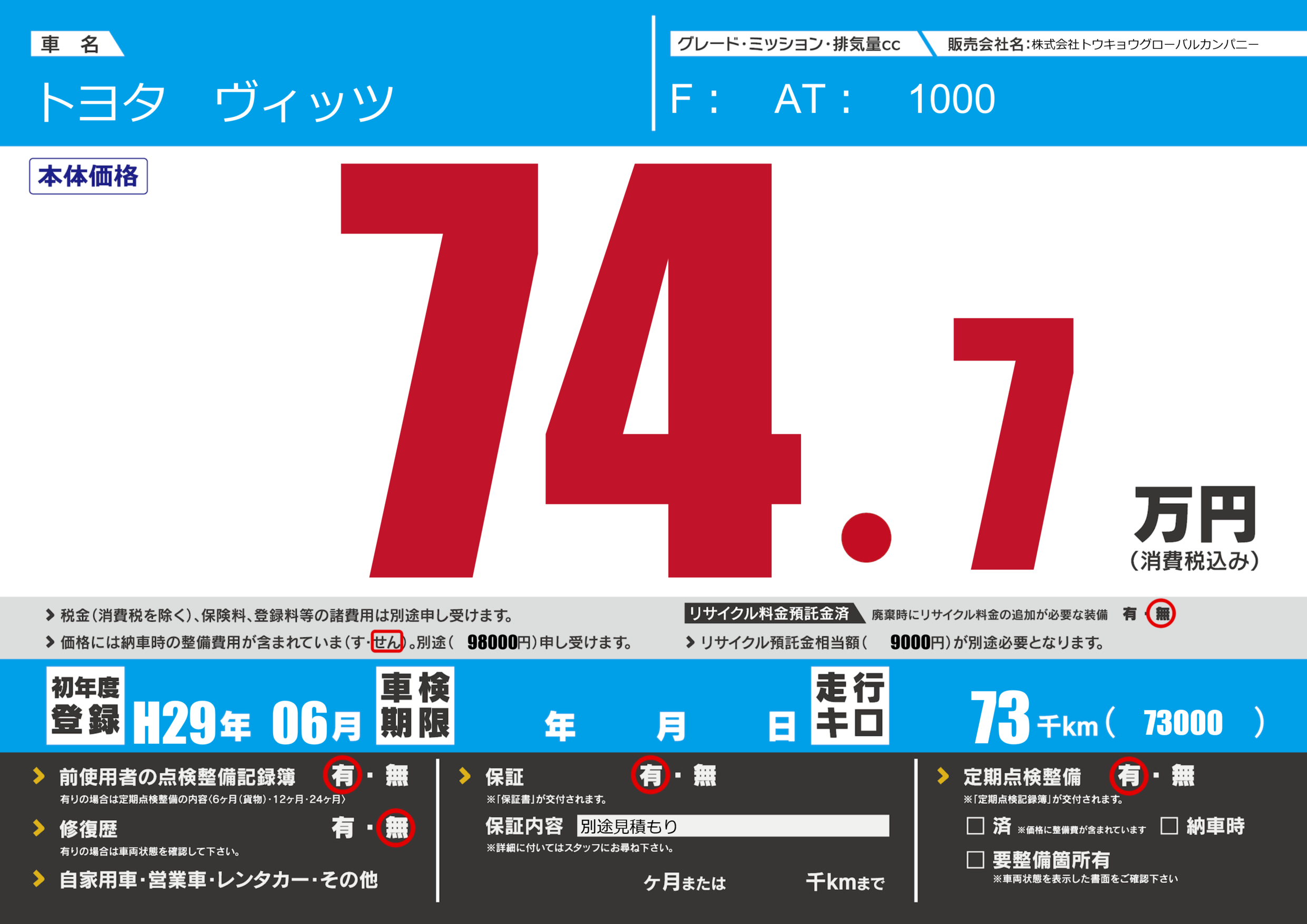 | 車名 | トヨタ ヴィッツ | グレード ミッション 排気量 |