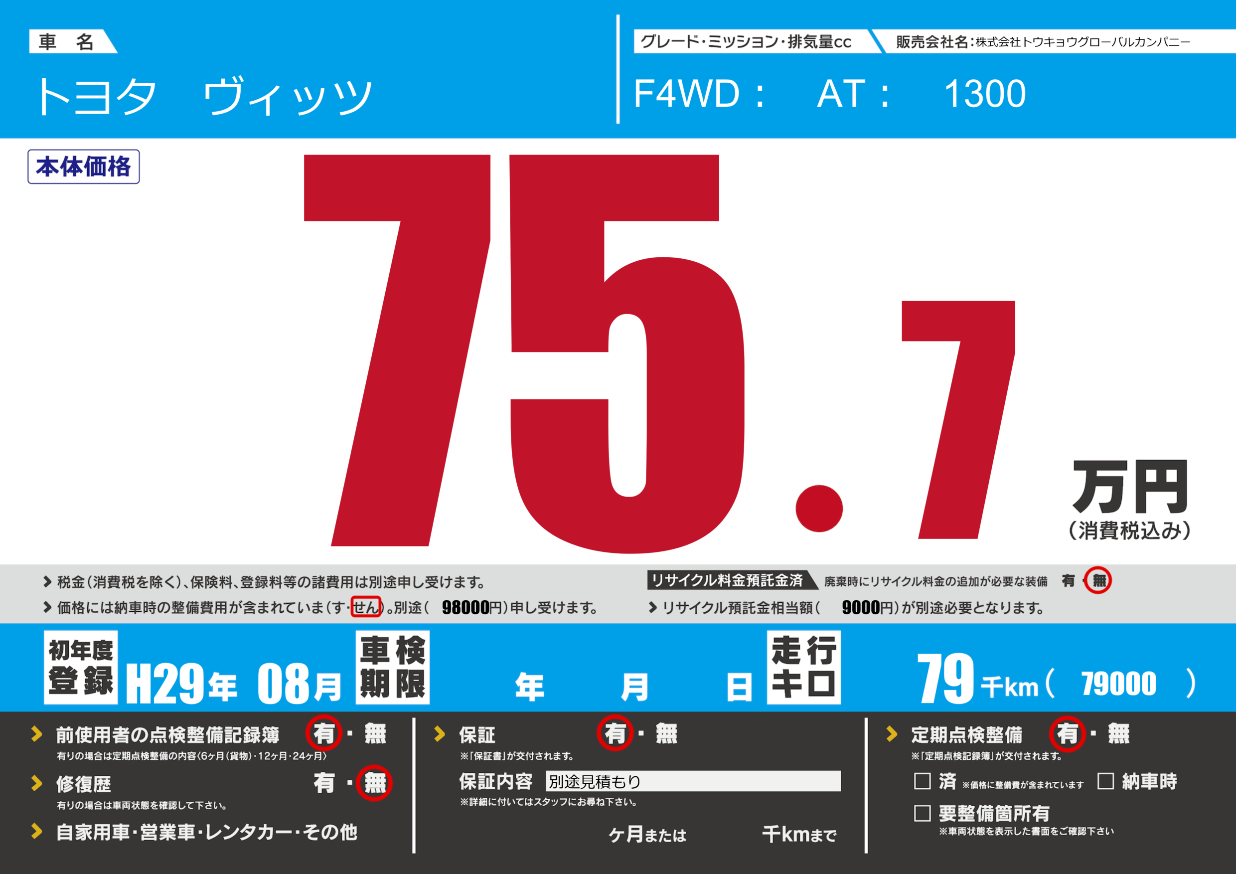 | 車名 | トヨタ ヴィッツ | グレード ミッション 排気量 |