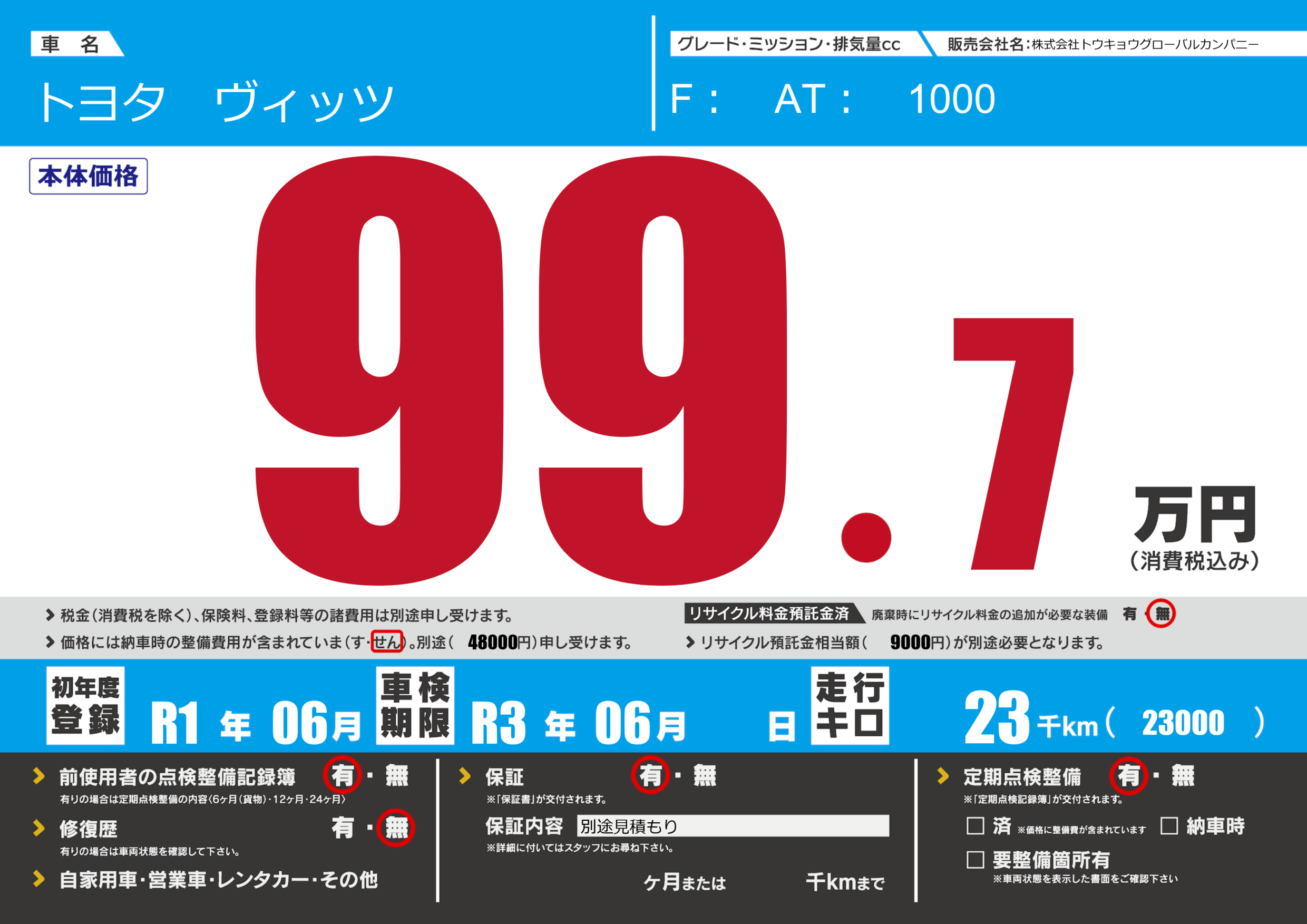 | 車名 | トヨタ ヴィッツ | グレード ミッション 排気量 |