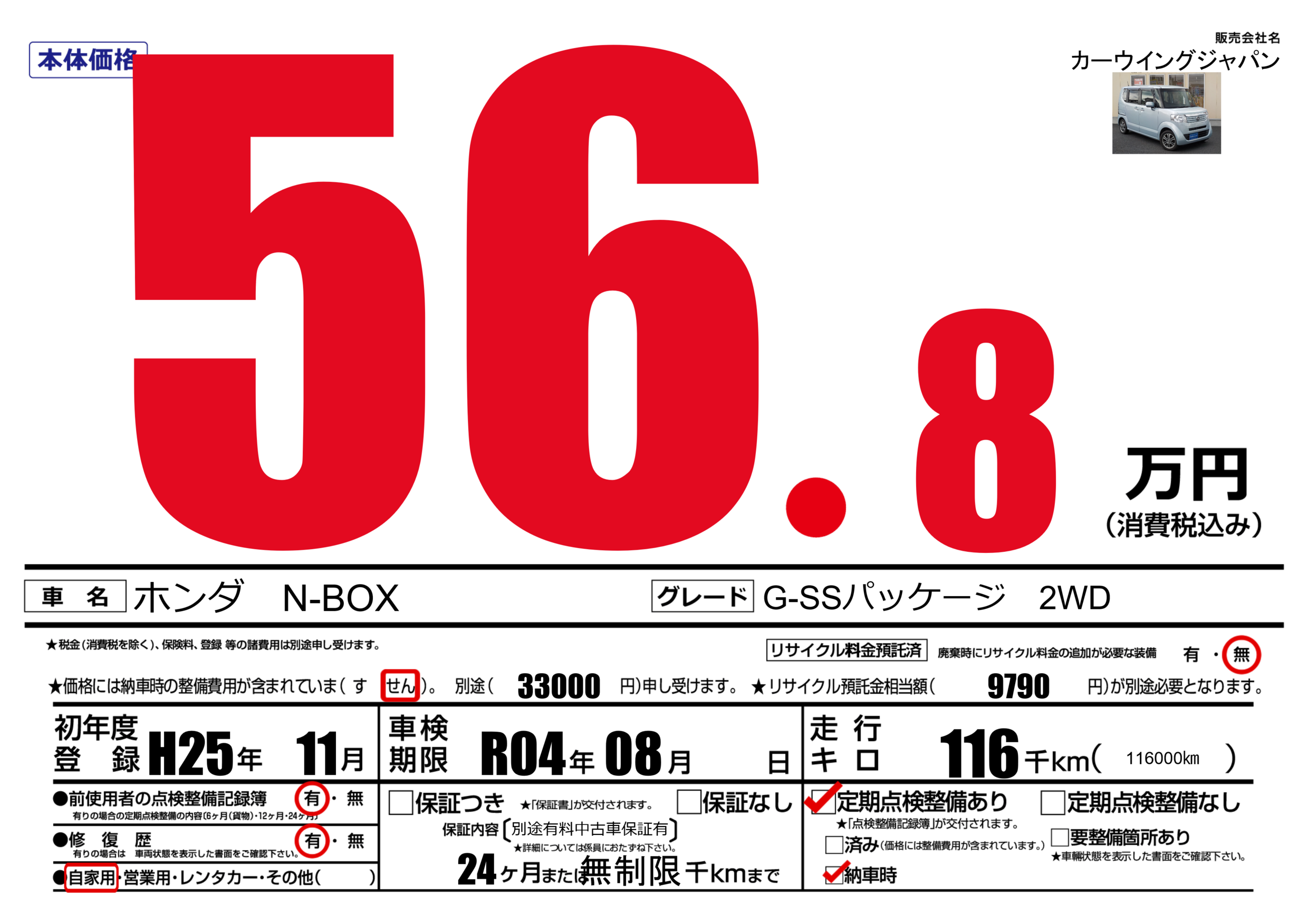 | 車名 | ホンダ N-BOX | グレード ミッション 排気量 |
