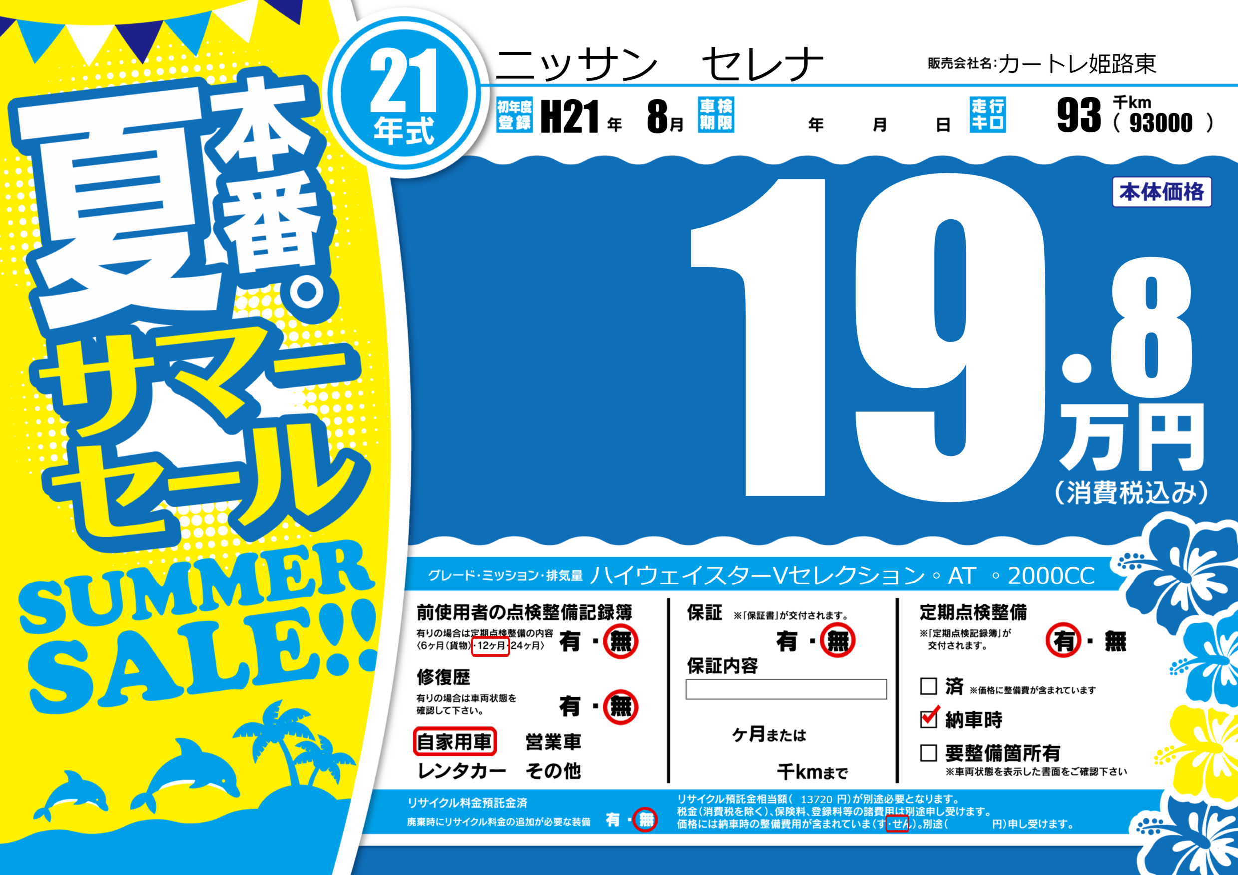 | 定期点検整備 | 定期点検整備あり 納車時あり | ||