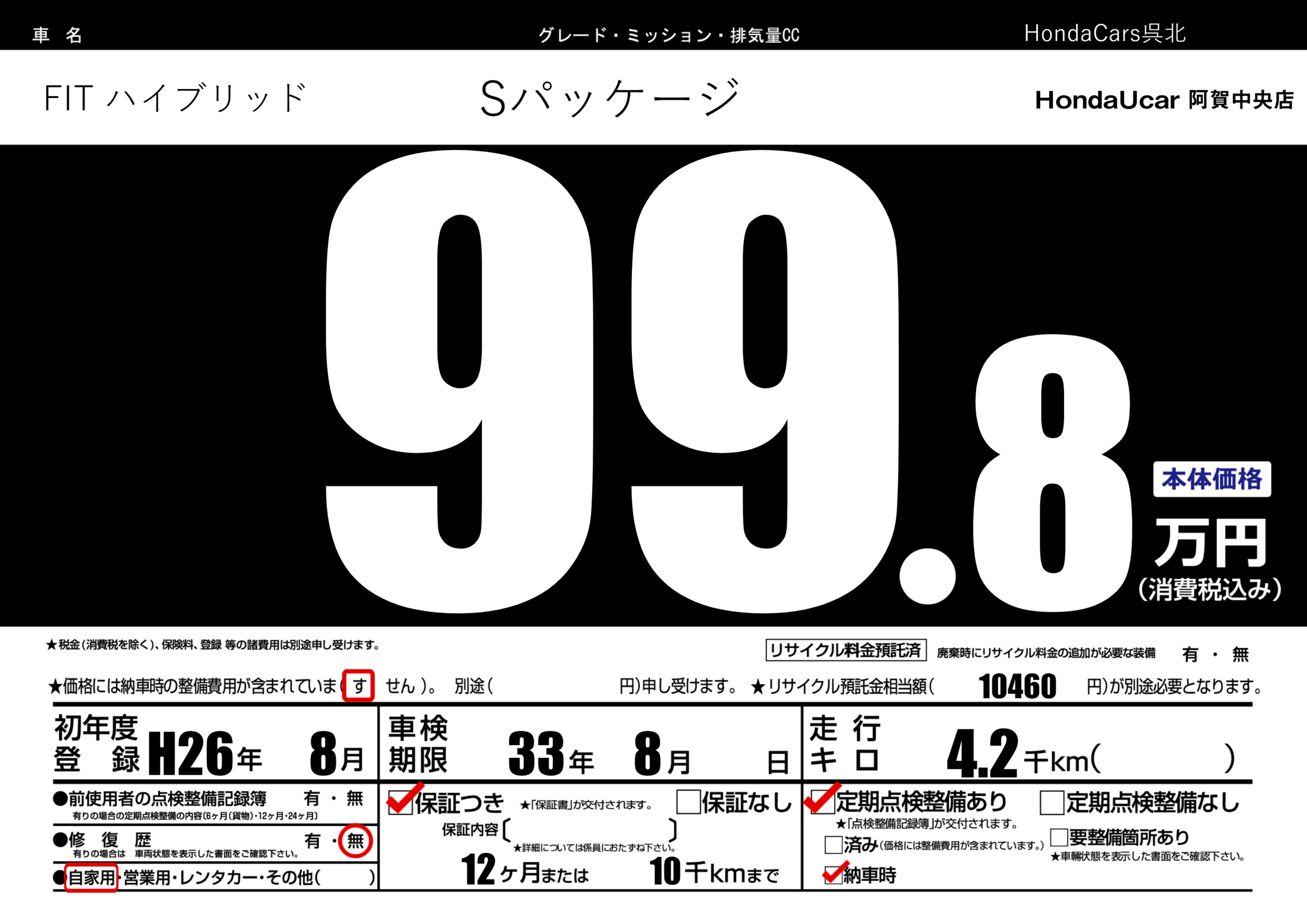 | 車名 | FIT ハイブリッド | グレード ミッション 排気量 |