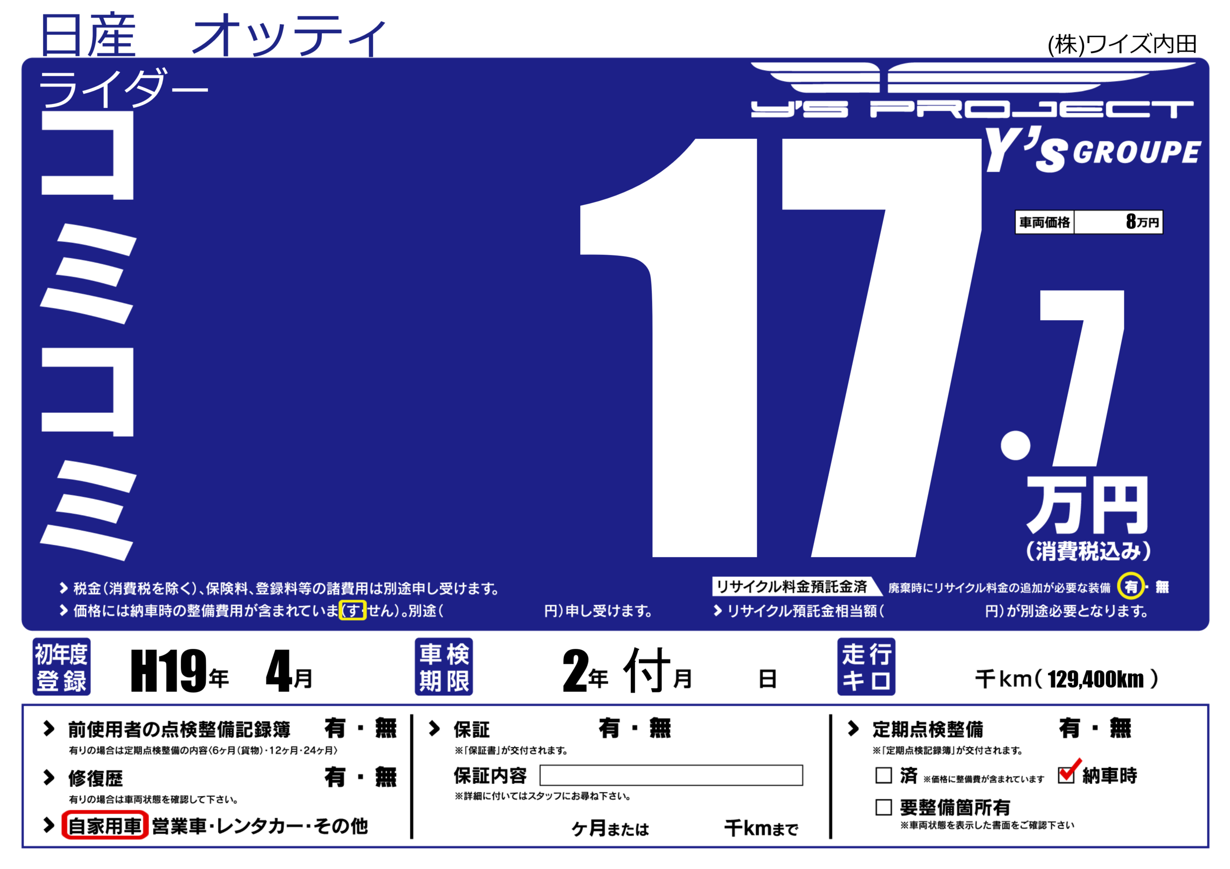 | 走行キロ | - | 初年度登録 | H19年4月 |