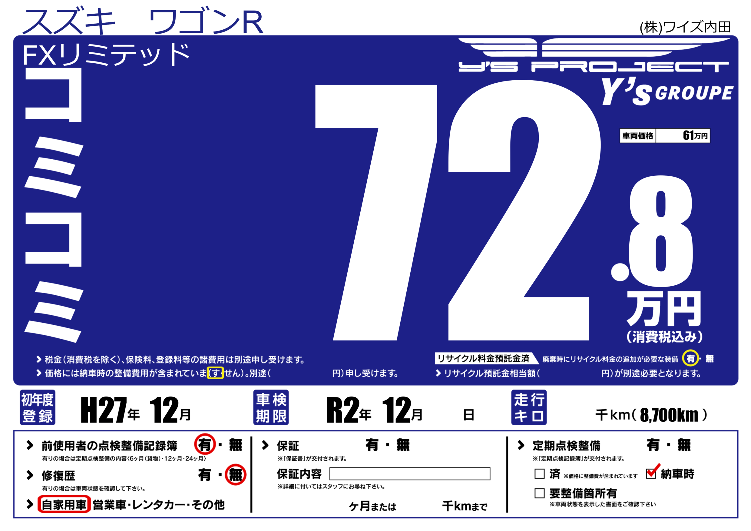 | 車検制限 | R2年 12月 - 日 | ||