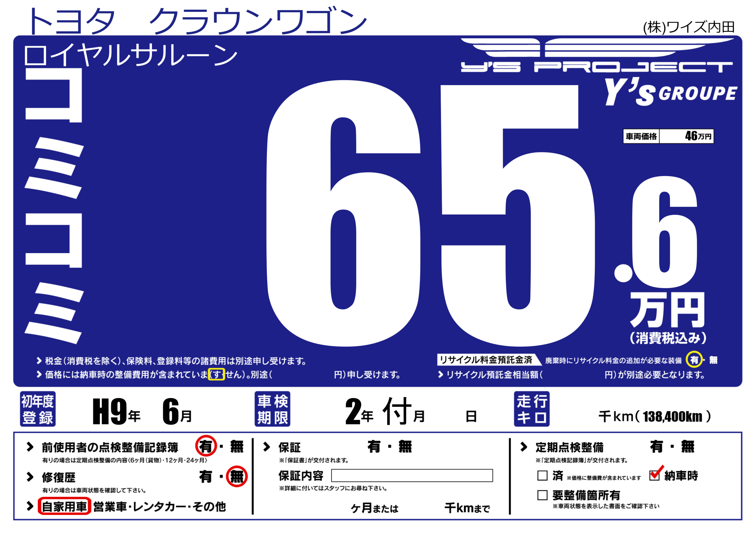| 車名 | トヨタ クラウンワゴン | グレード ミッション 排気量 |