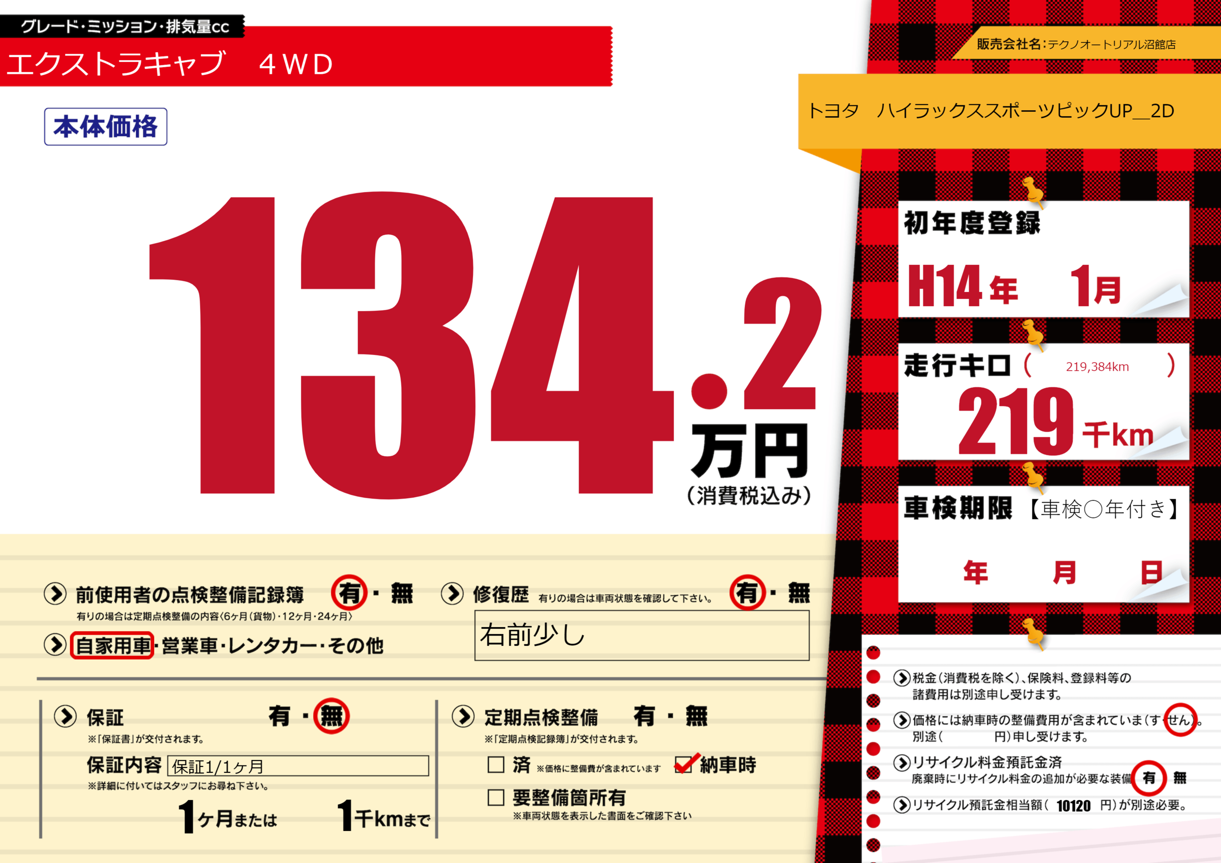 保証なし 保証内容(保証1/1ヶ月) 1ヶ月または(1)千kmまで |