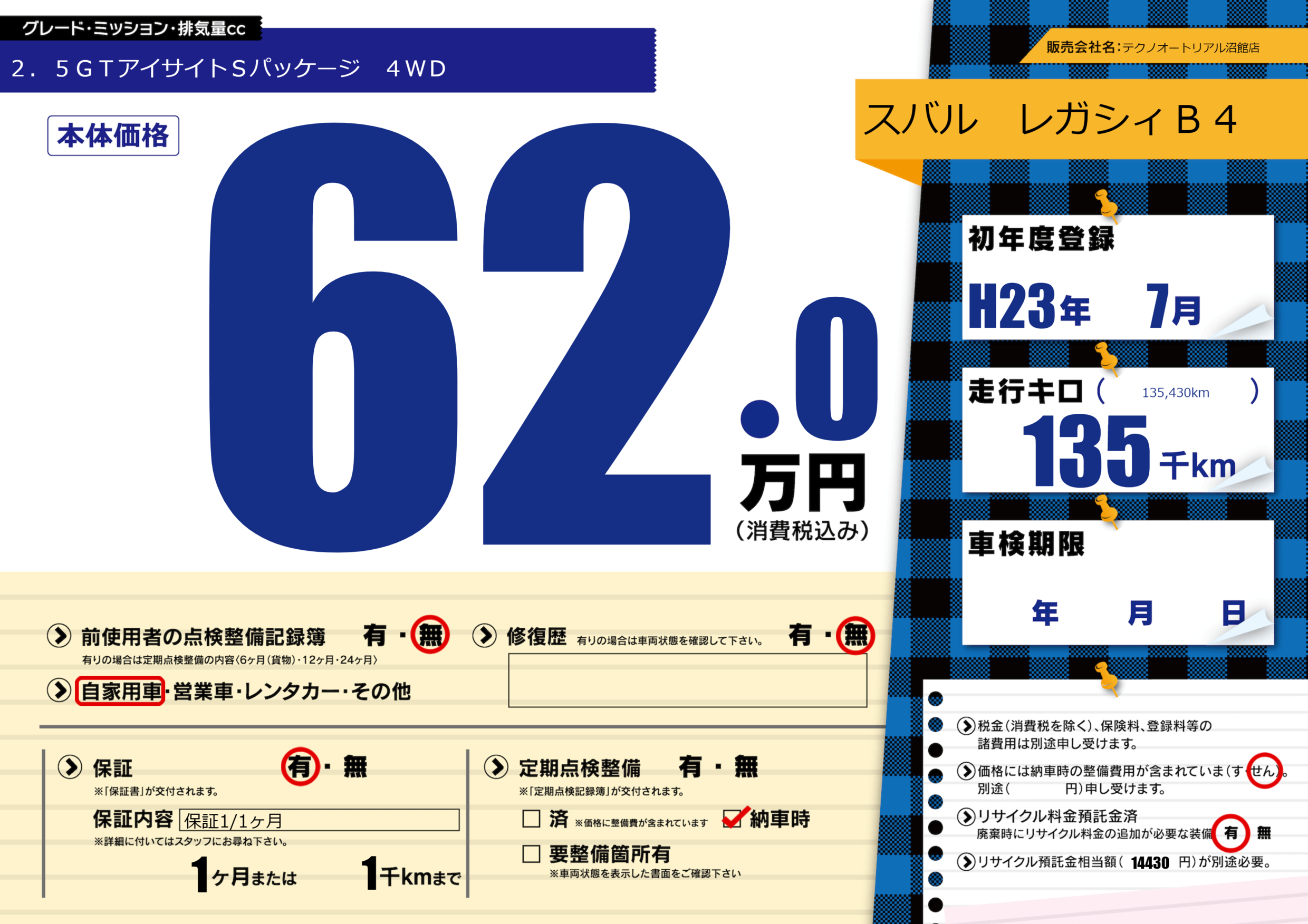 | 車名 | スバル レガシィB4 | グレード ミッション 排気量 |