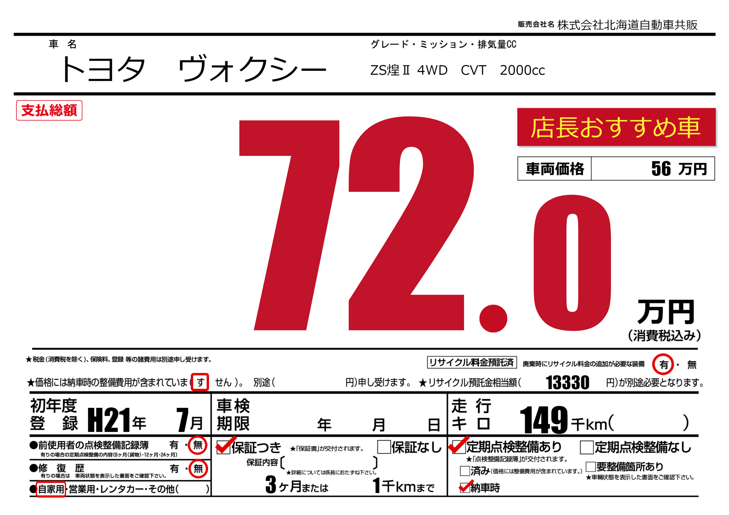 | 車名 | トヨタ ヴォクシー | グレード ミッション 排気量 |