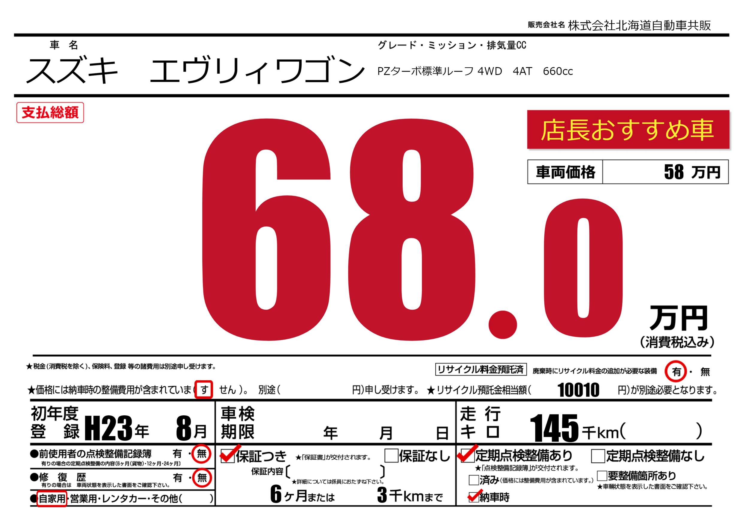 | 車名 | スズキ エヴリィワゴン | グレード ミッション 排気量 |