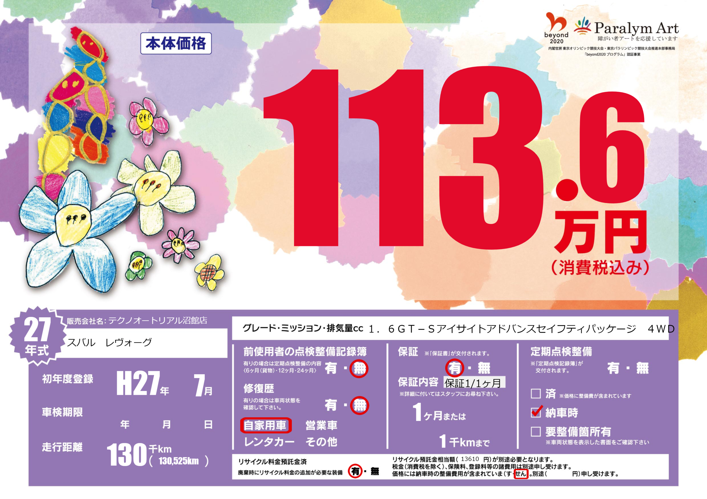 | 走行キロ | 13万km | 初年度登録 | H27年7月 |