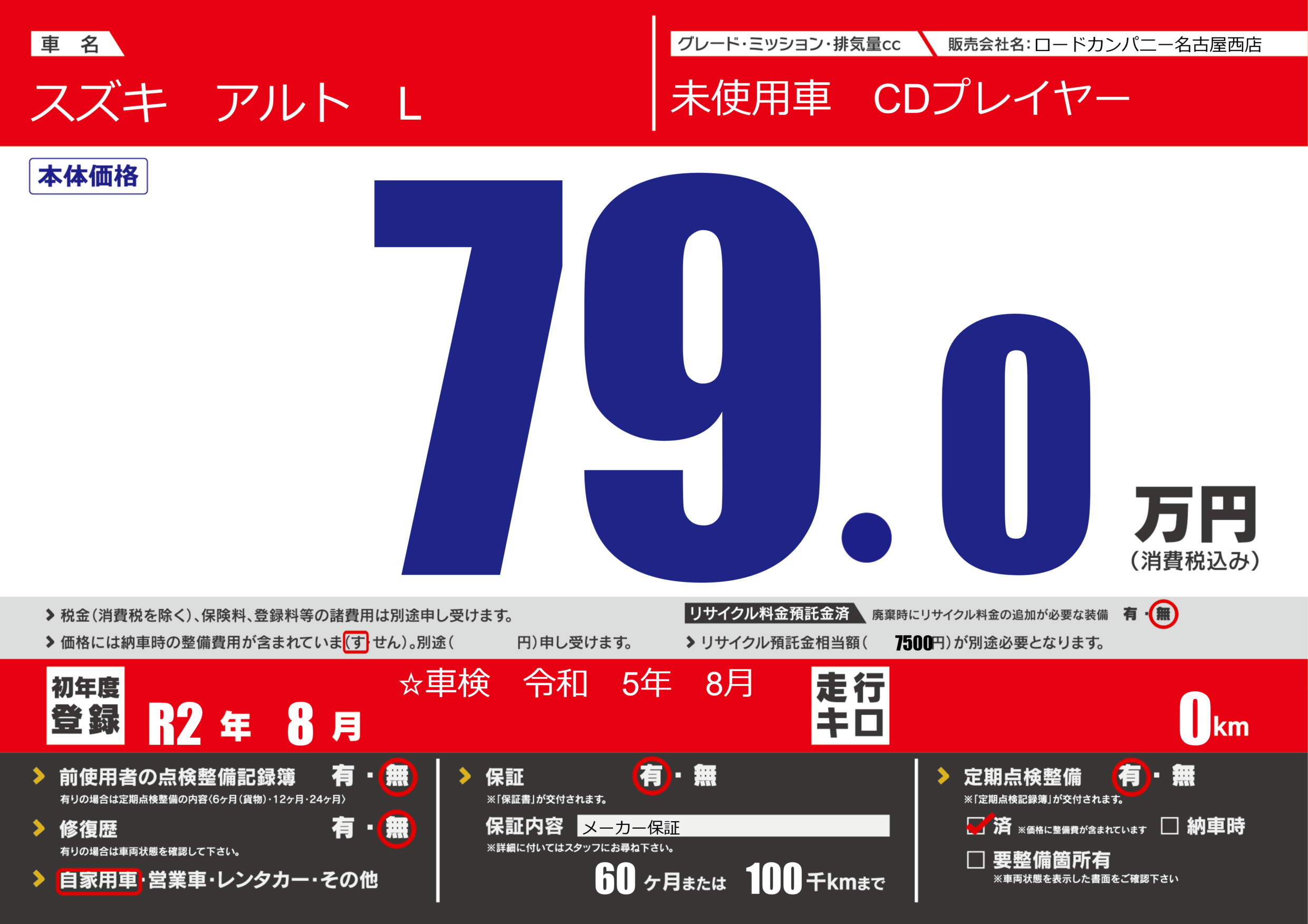 | 定期点検整備 | 定期点検整備あり 定期点検整備済み | ||