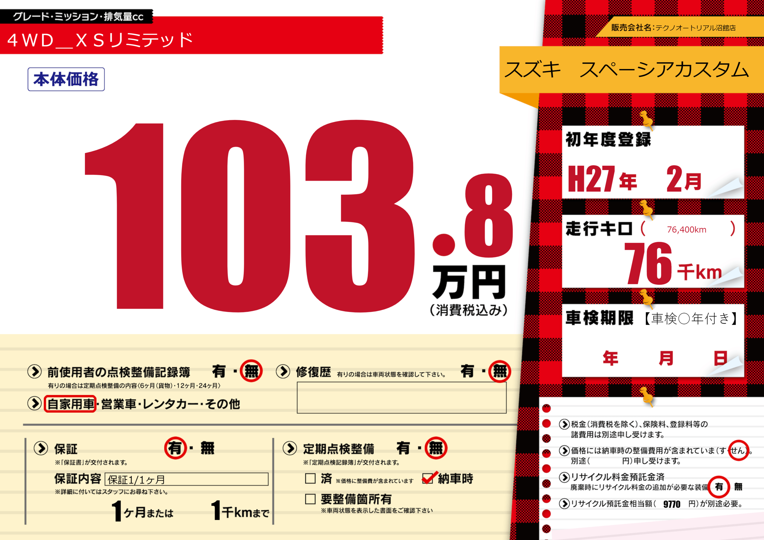 保証付き 保証内容(保証1/1ヶ月) 1ヶ月または(1)千kmまで |