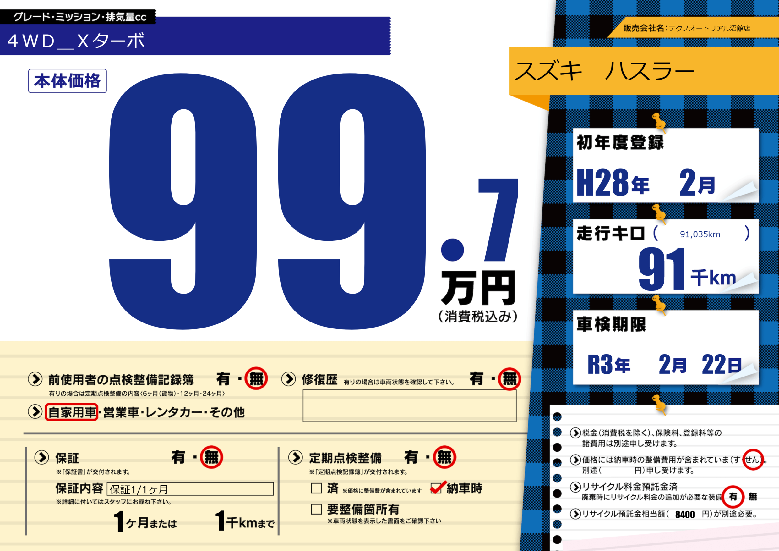 | 車名 | スズキ ハスラー | グレード ミッション 排気量 |