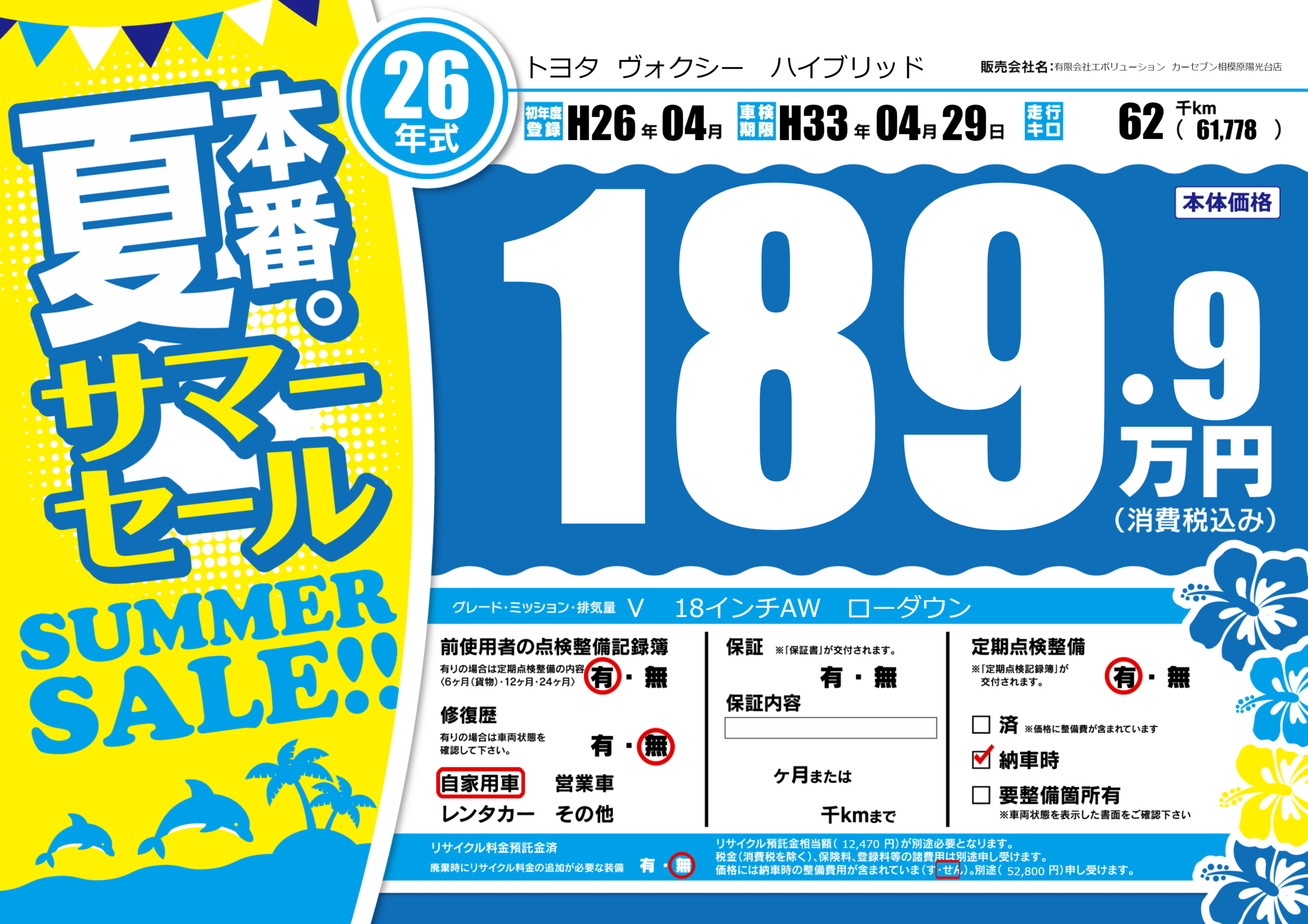 | 車名 | トヨタ ヴォクシー ハイブリッド | グレード ミッション 排気量 |