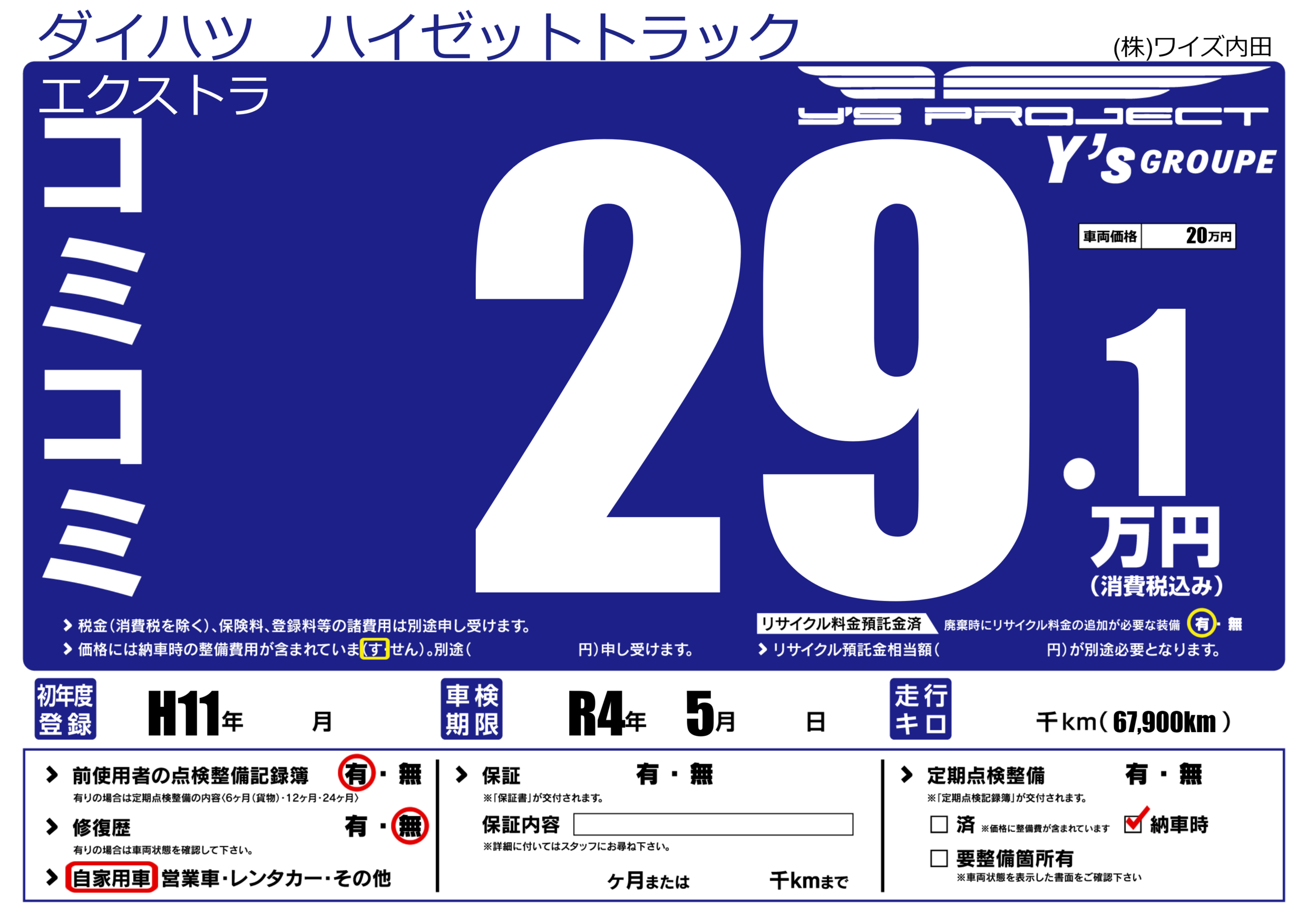 | 車名 | ダイハツ ハイゼットトラック | グレード ミッション 排気量 |