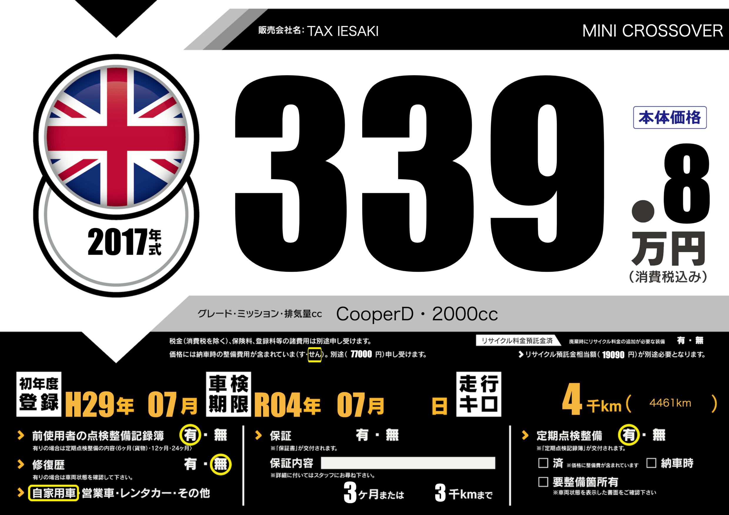 | 車名 | MINI CROSSOVER | グレード ミッション 排気量 |