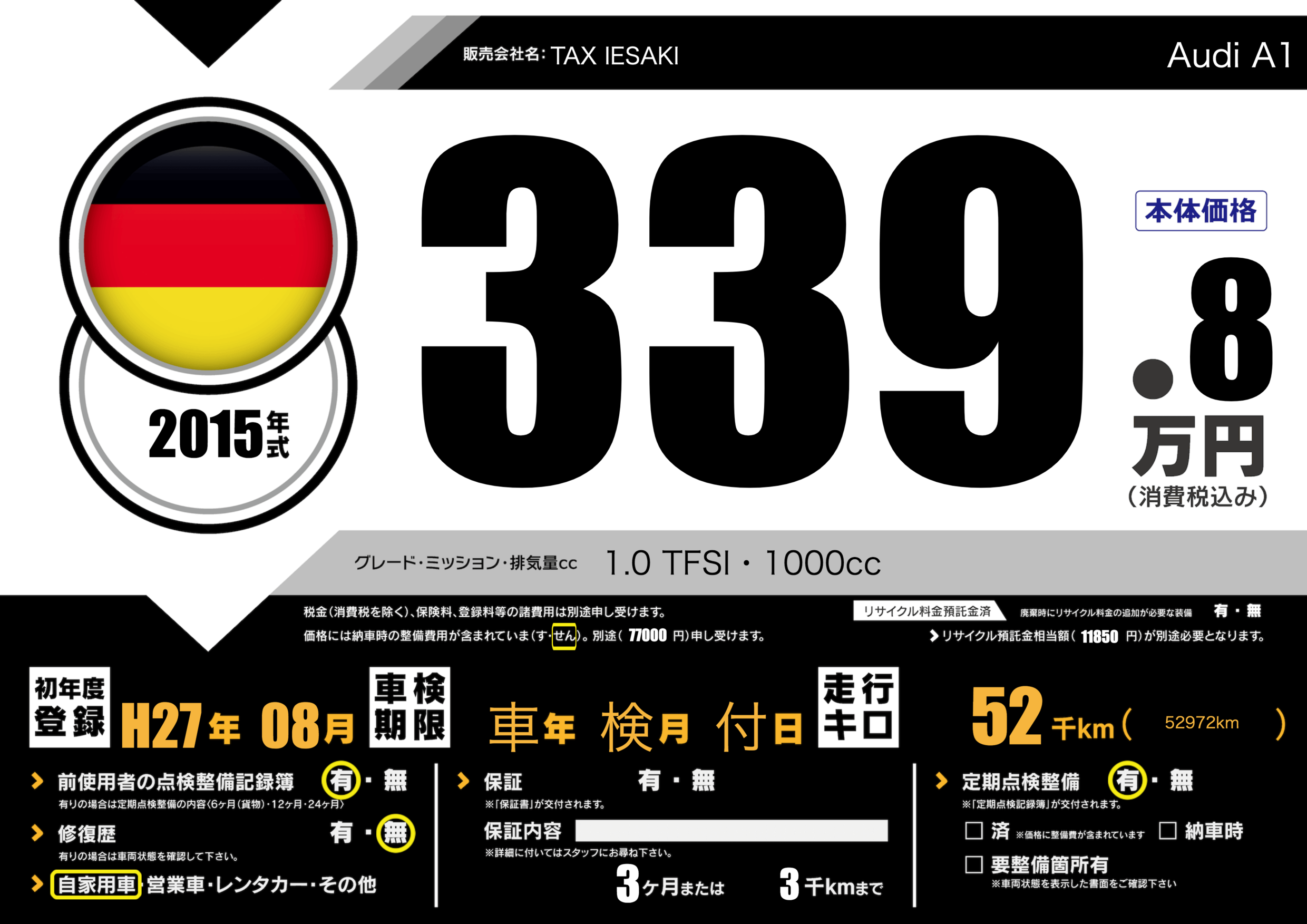 | 車名 | Audi A1 | グレード ミッション 排気量 |