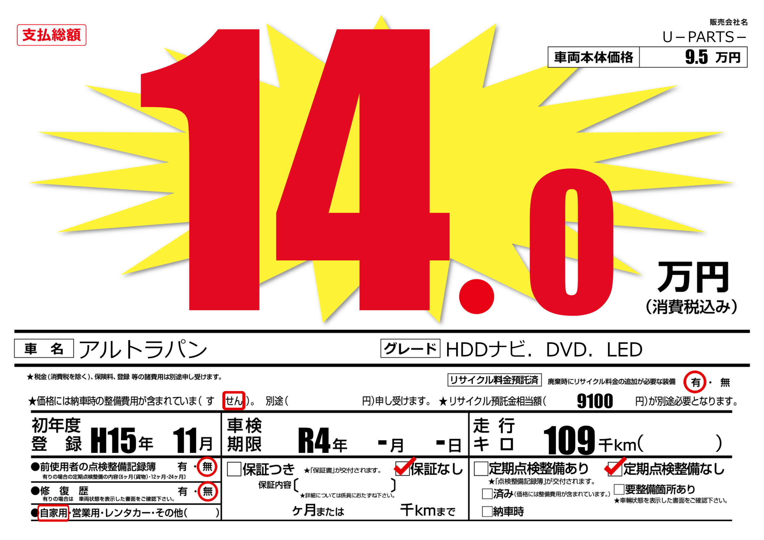| 走行キロ | 10.9万km | 初年度登録 | H15年11月 |