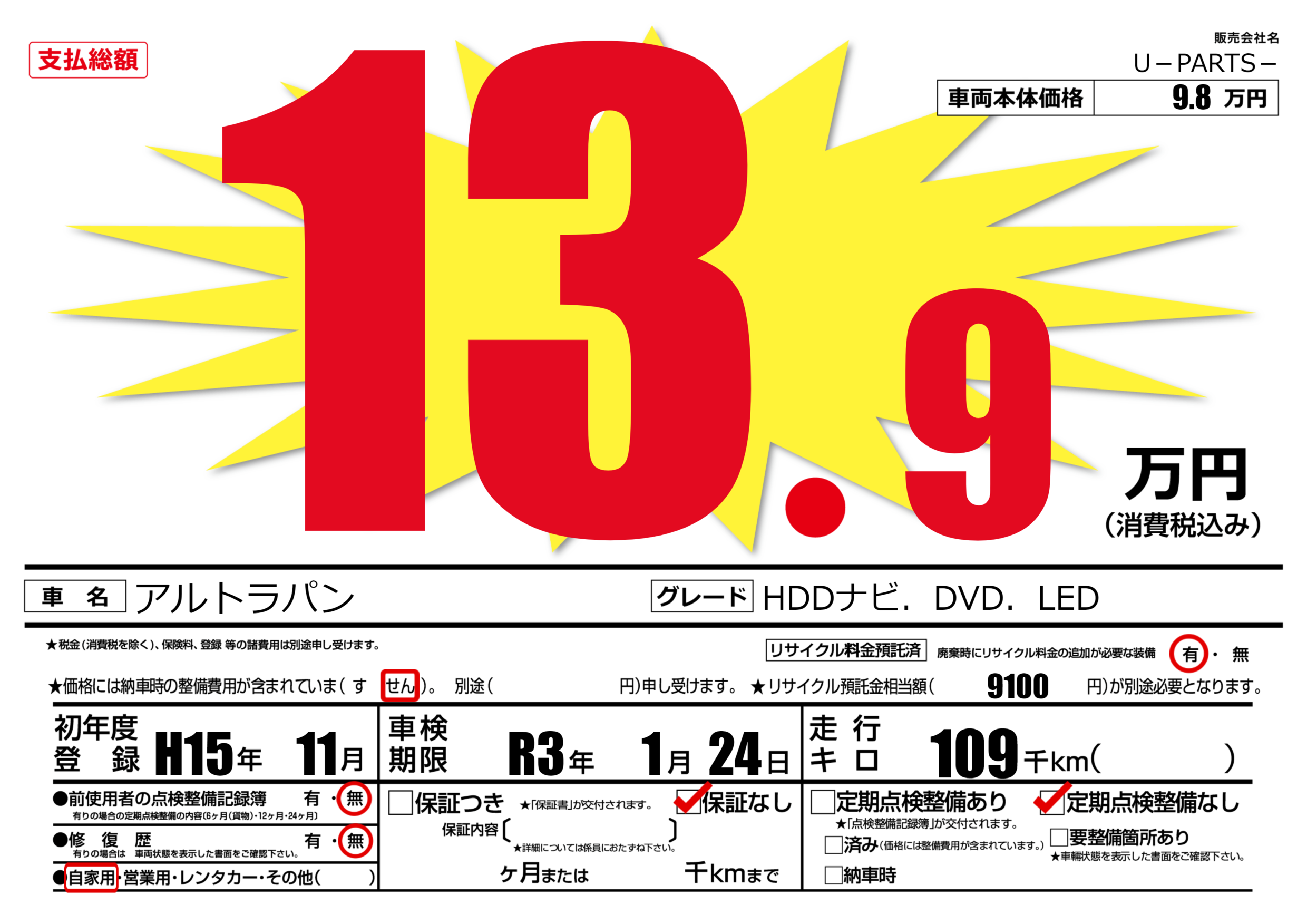 | 走行キロ | 10.9万km | 初年度登録 | H15年11月 |